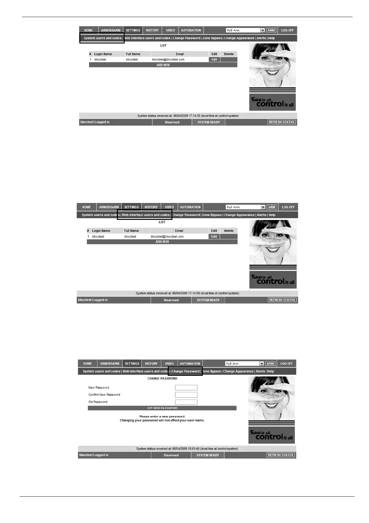 On The Main Page menu, click Settings, then Web Interface Users and Codes, the following page appears: