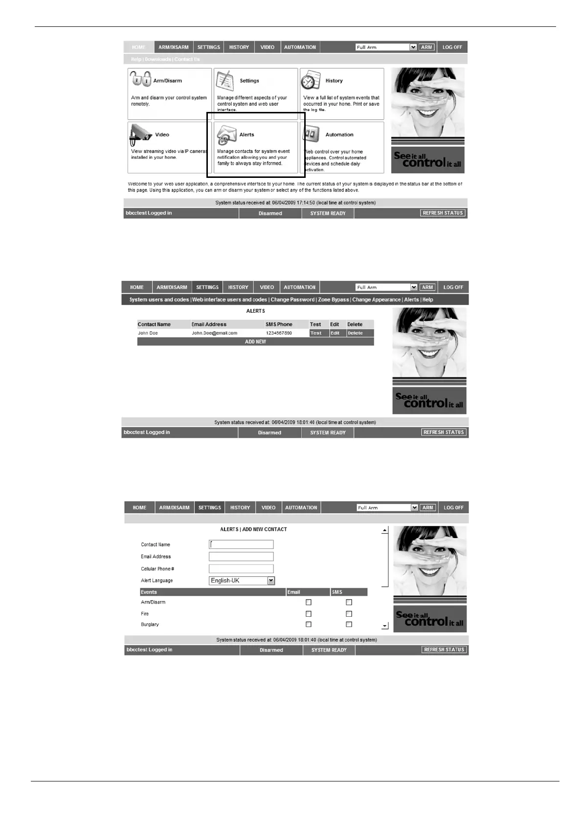 2. Press Add new to add email addresses or cellular telephone numbers for the alert messages.