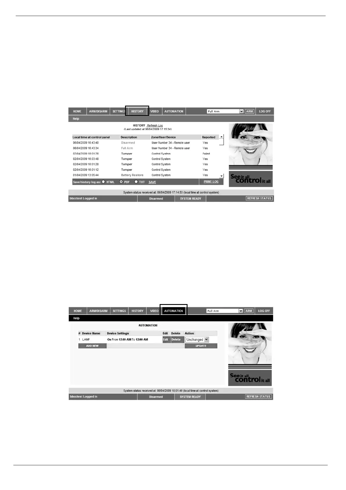 The History page enables you to view the system’s event log. The events are arranged in a table that offers the