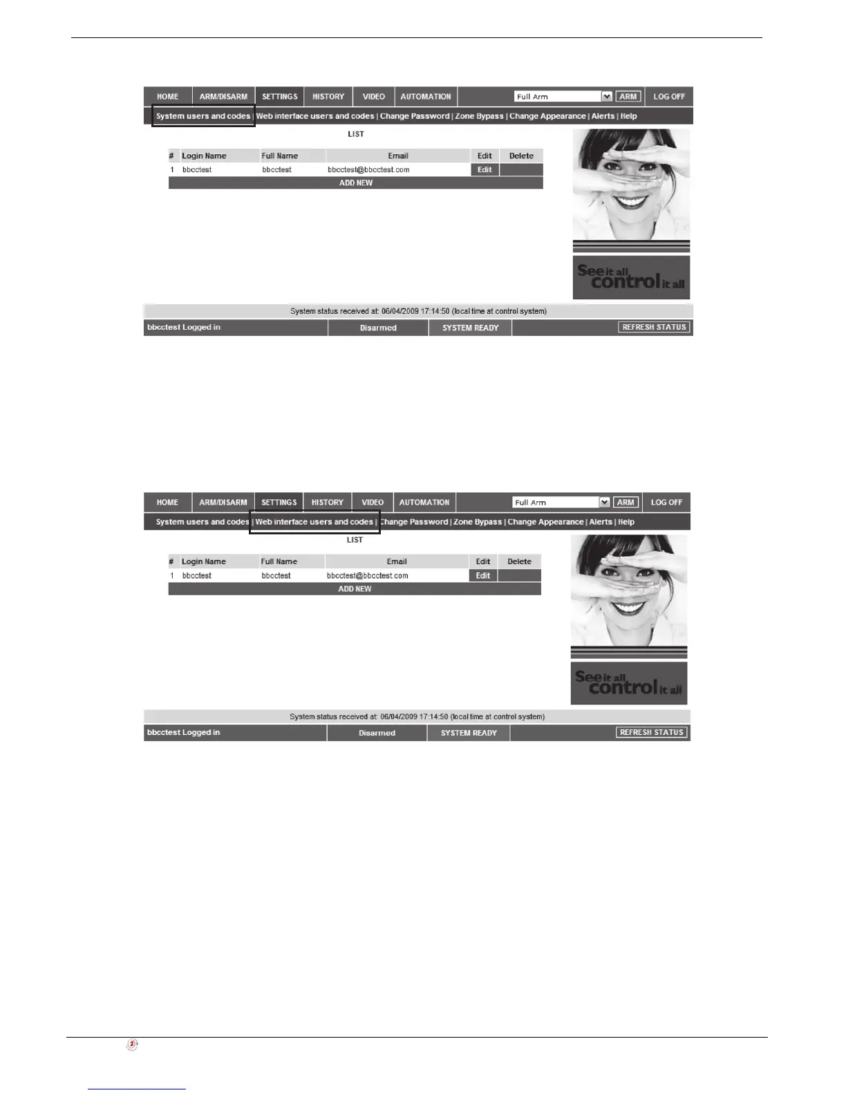 On The Main Page menu, click Settings, then Web Interface Users and Codes, the following page appears: