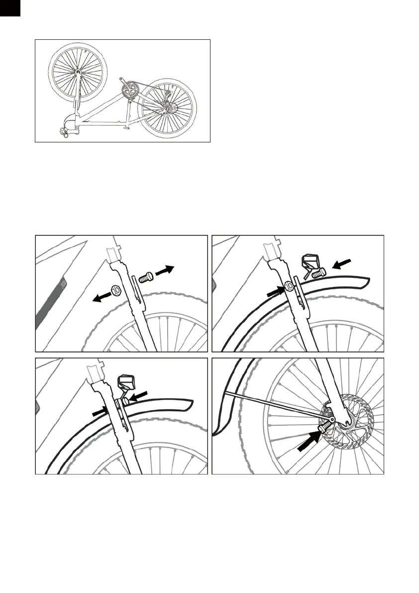 D) Secure the front mudguard. (There are 2 screws on the fork blades for securing the mudguard.)