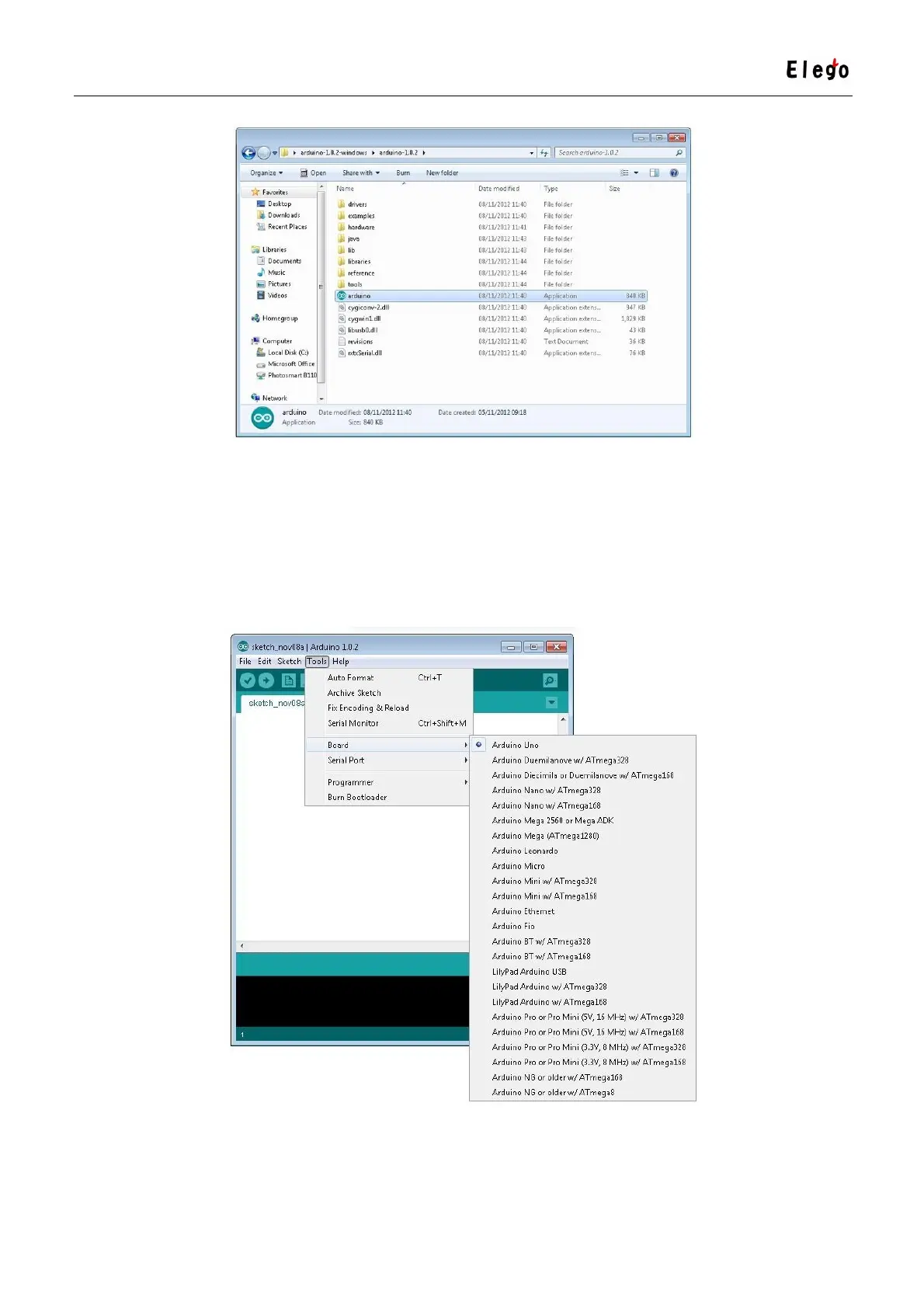 Board and then 'Arduino Uno' or 'Leonardo' as appropriate.