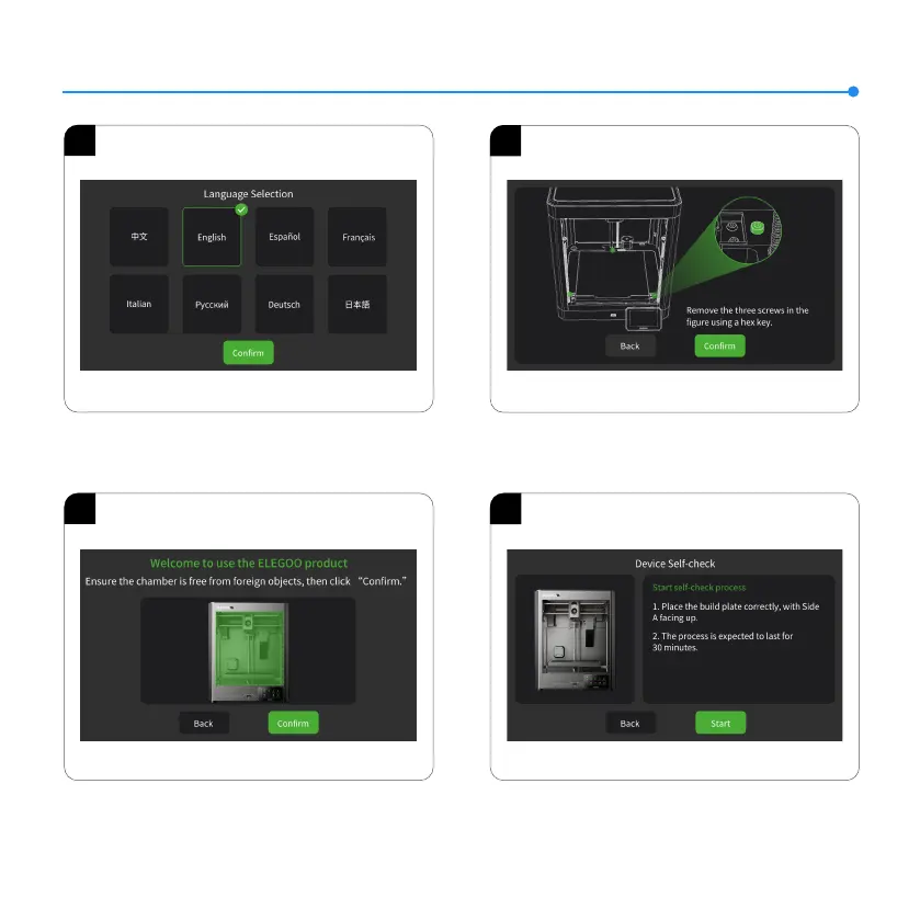 1. Selección de idioma 2. Siga las indicaciones de la pantalla para retirar los tres tornillos