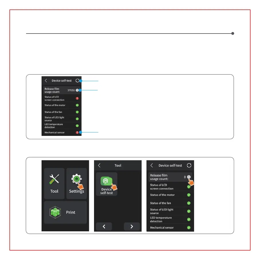 リースフィルムの使用回数が60,000回に近づくと、デバイスはリリースフィルムの交換を促します。デバイスセルフテス
