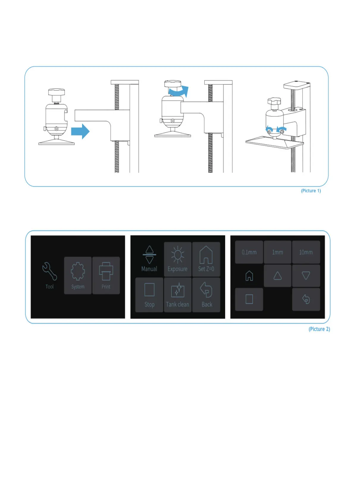 to zero”. (See Picture 2) When the build platform stops please use one hand to press it and make sure it’s in the