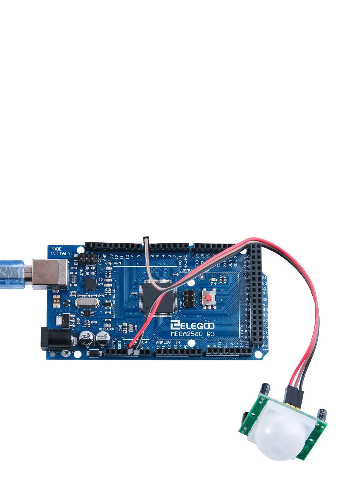 Power the PIR with 5V and connect ground to ground. Then connect the output to