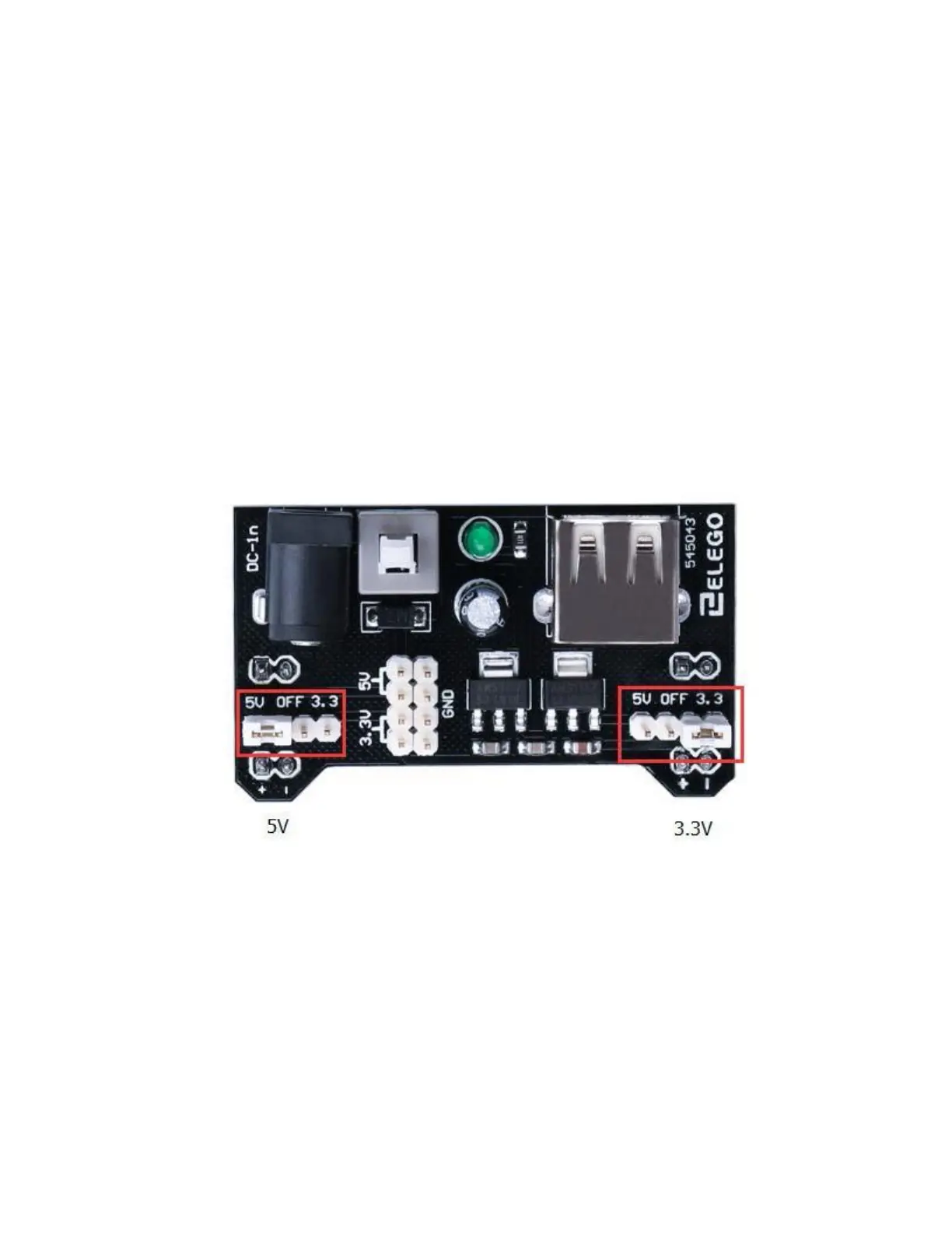 move jumper to the corresponding pins. Note: power indicator LED and the breadboard power rails