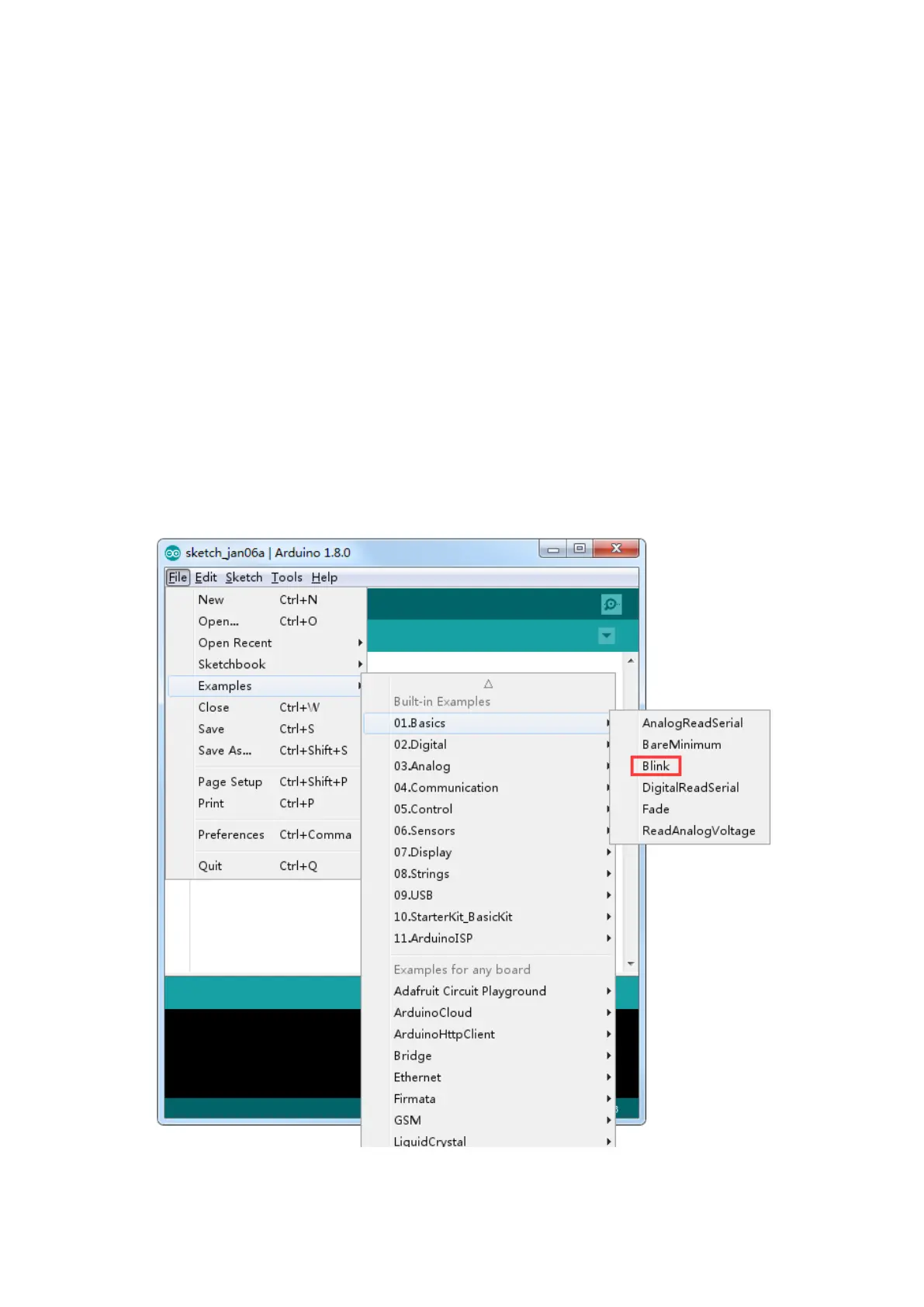 Load the 'Blink' sketch that you will find in the IDE's menu system under File >