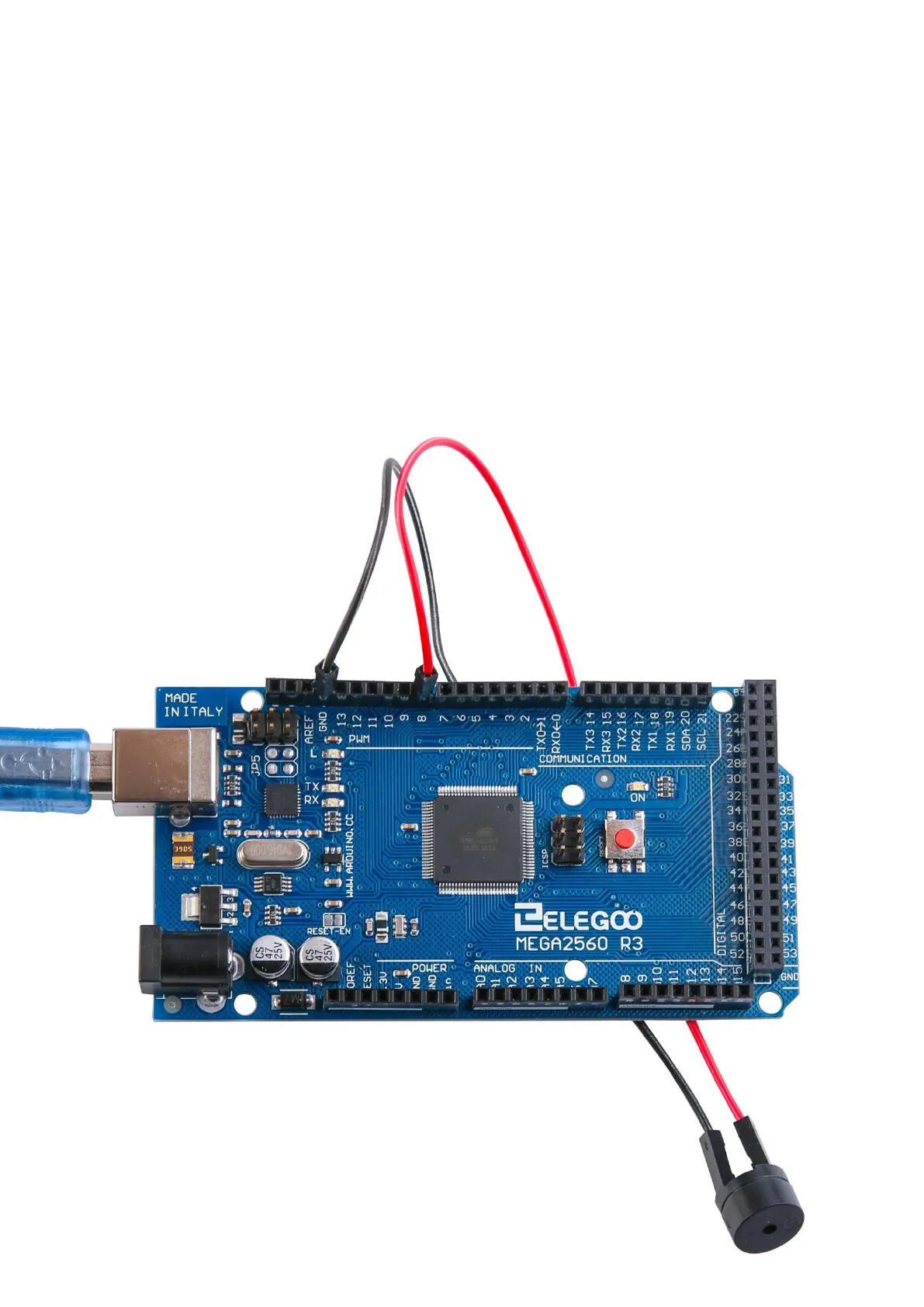 Wiring the buzzer connected to the MEGA2560 R3 board, the red (positive) to the