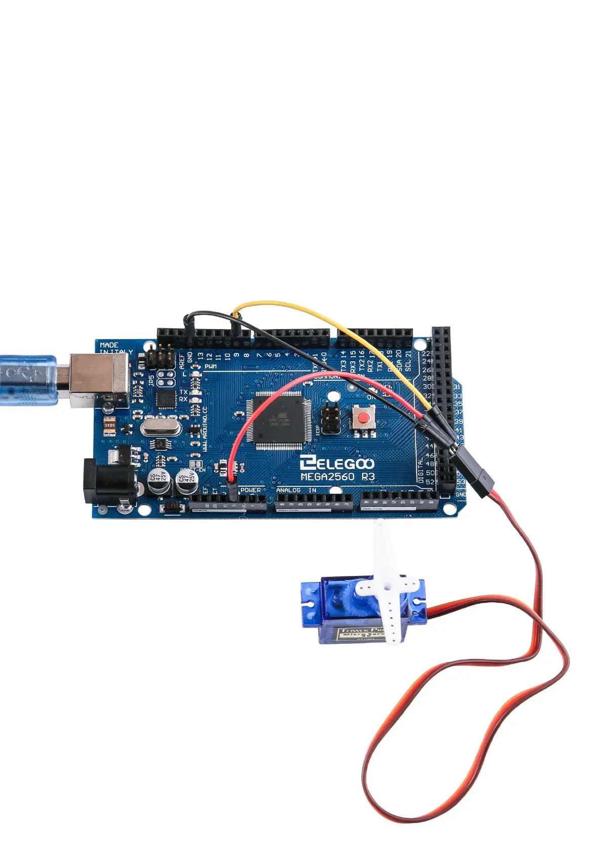 In the picture, the brown wire of servo is adapted via the black M-M wires, the red
