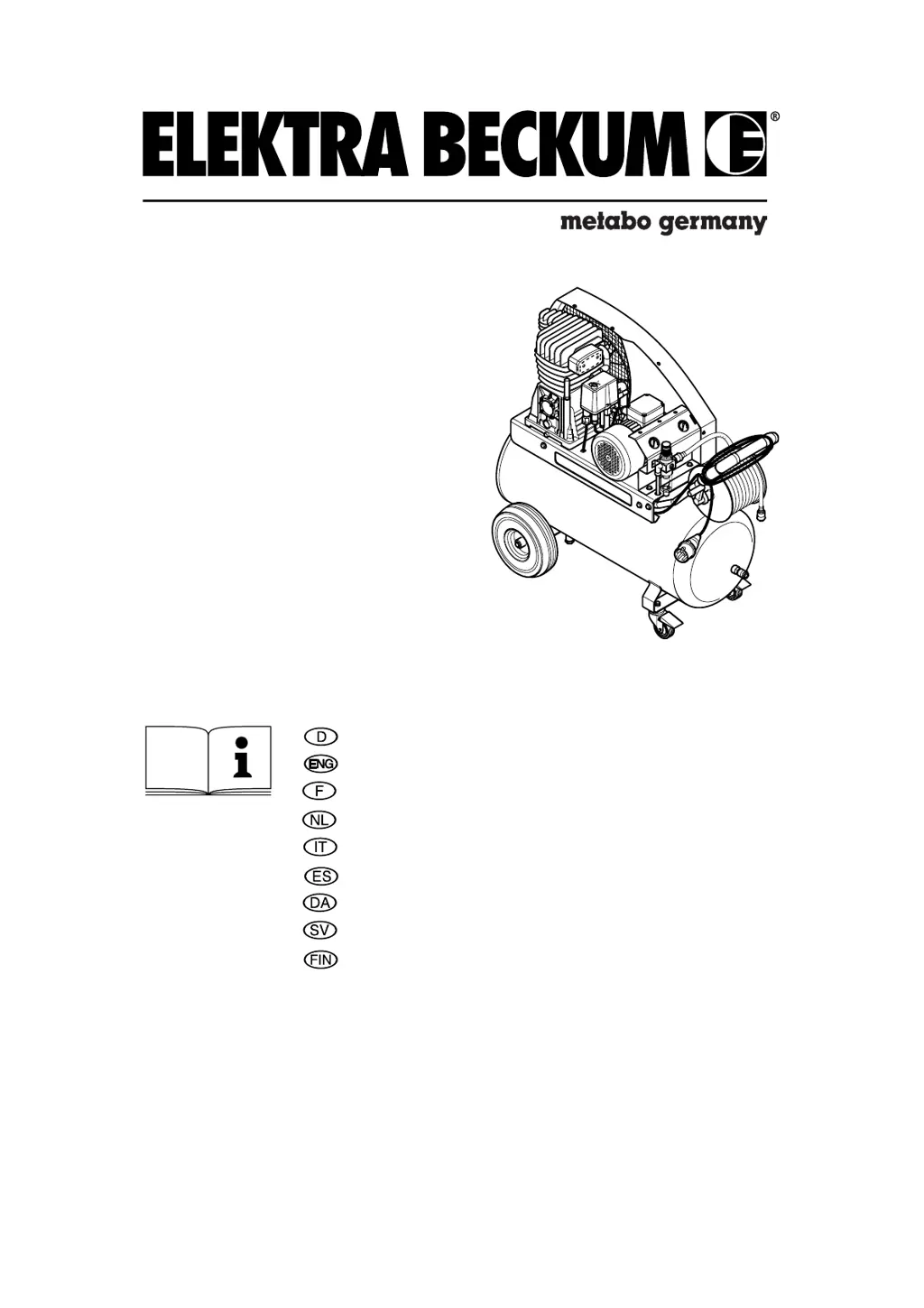 There are several reasons why your Elektra Beckum Air Compressor might not be running. It could be due to: * No mains voltage: Check the cables, plug, outlet, and mains fuse. * Mains voltage too low: Use only extension cables with a sufficient lead cross-section (see Technical Specifications). Avoid using an extension cable with a cold machine. * The compressor was stopped by unplugging: Switch the compressor OFF at the On/Off switch, then ON again. * The motor has overheated due to insufficient cooling (cooling fins covered): Remove the cause for overheating and allow it to cool down for approximately 10 minutes before restarting.