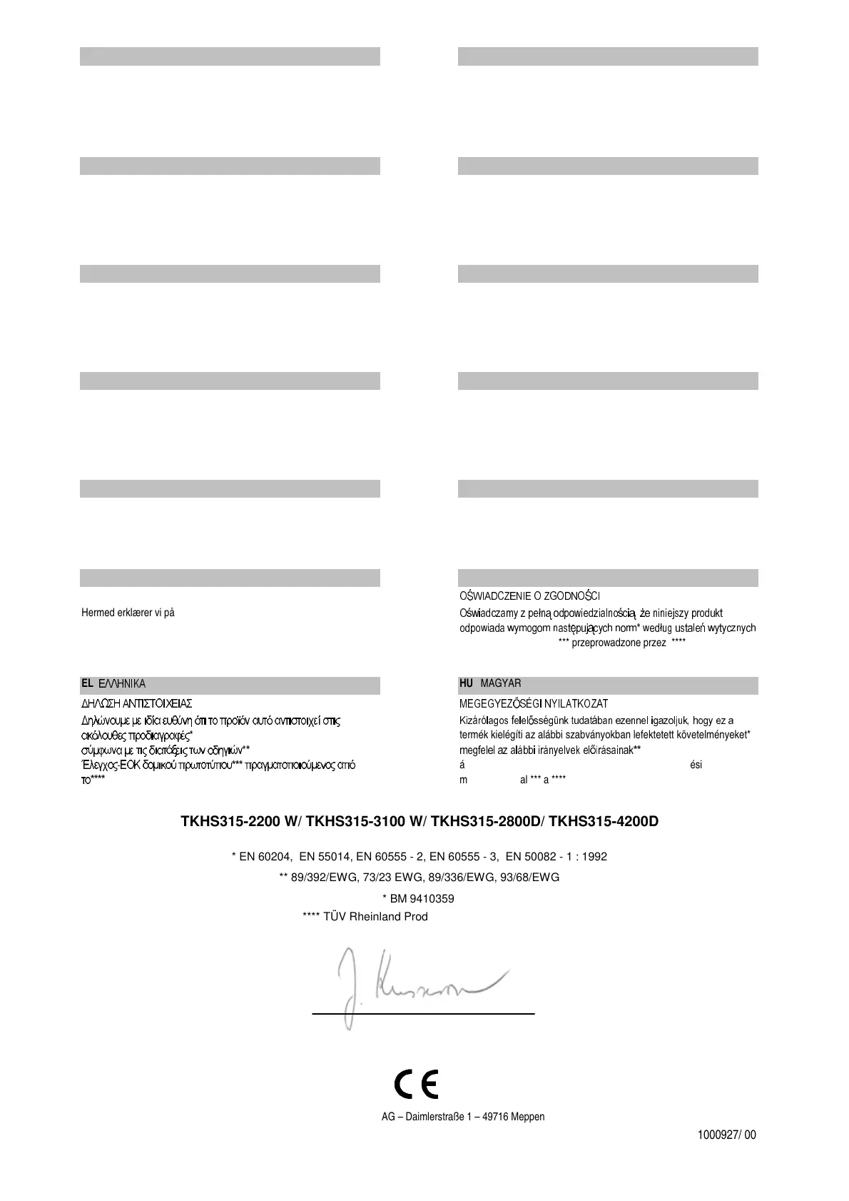 * EN 60204, EN 55014, EN 60555 - 2, EN 60555 - 3, EN 50082 - 1 : 1992