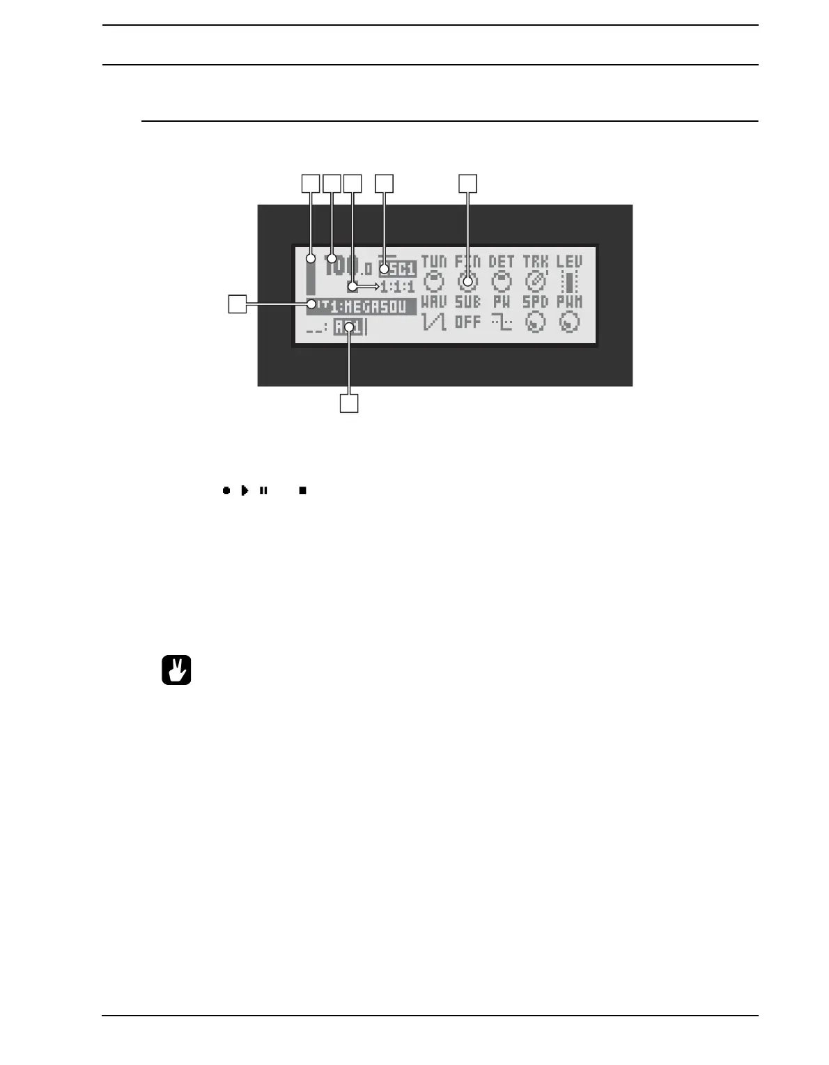 3. The playback/recording status of the sequencer shown by the standard “record”, “play”, “pause” and “stop”
