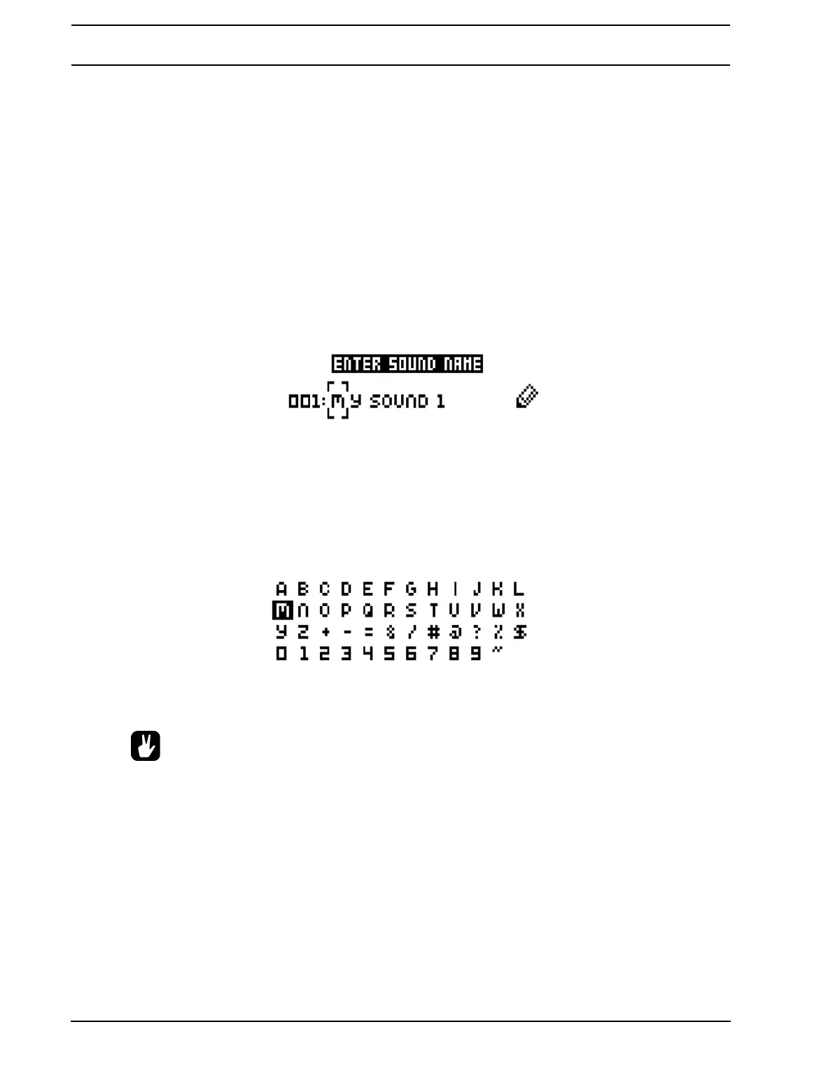 The [LEFT] and [RIGHT] arrow keys are used to navigate between the letters. Turning the LEVEL knob or