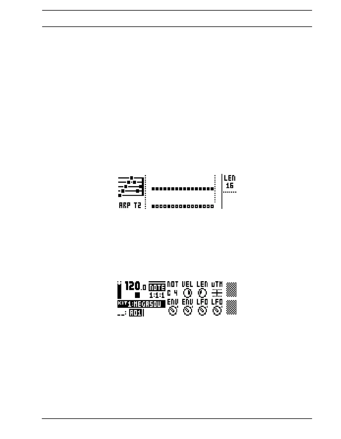 Arpeggio note offsets can be inserted by pressing a [TRIG] key and turning the LEVEL knob. By pressing sev-