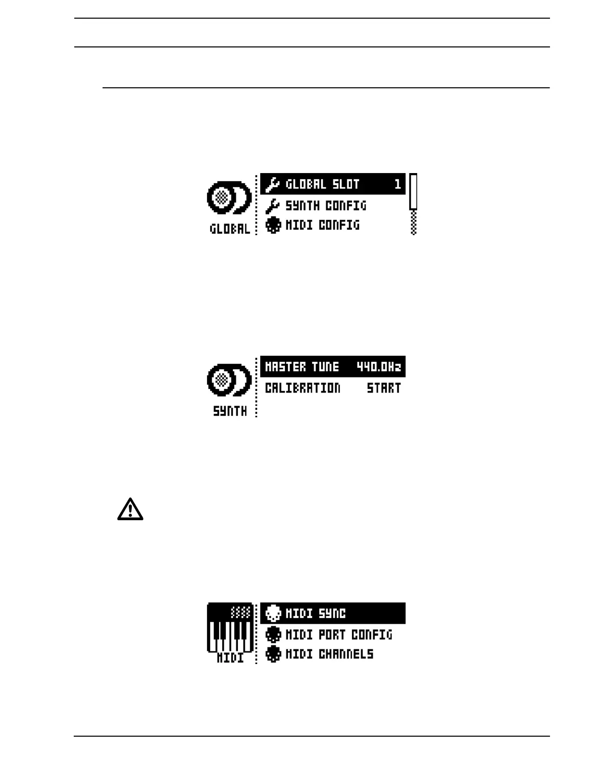 The GLOBAL menu offers settings that affect the Analog Four on a global level. Global tune, MIDI and CV set-