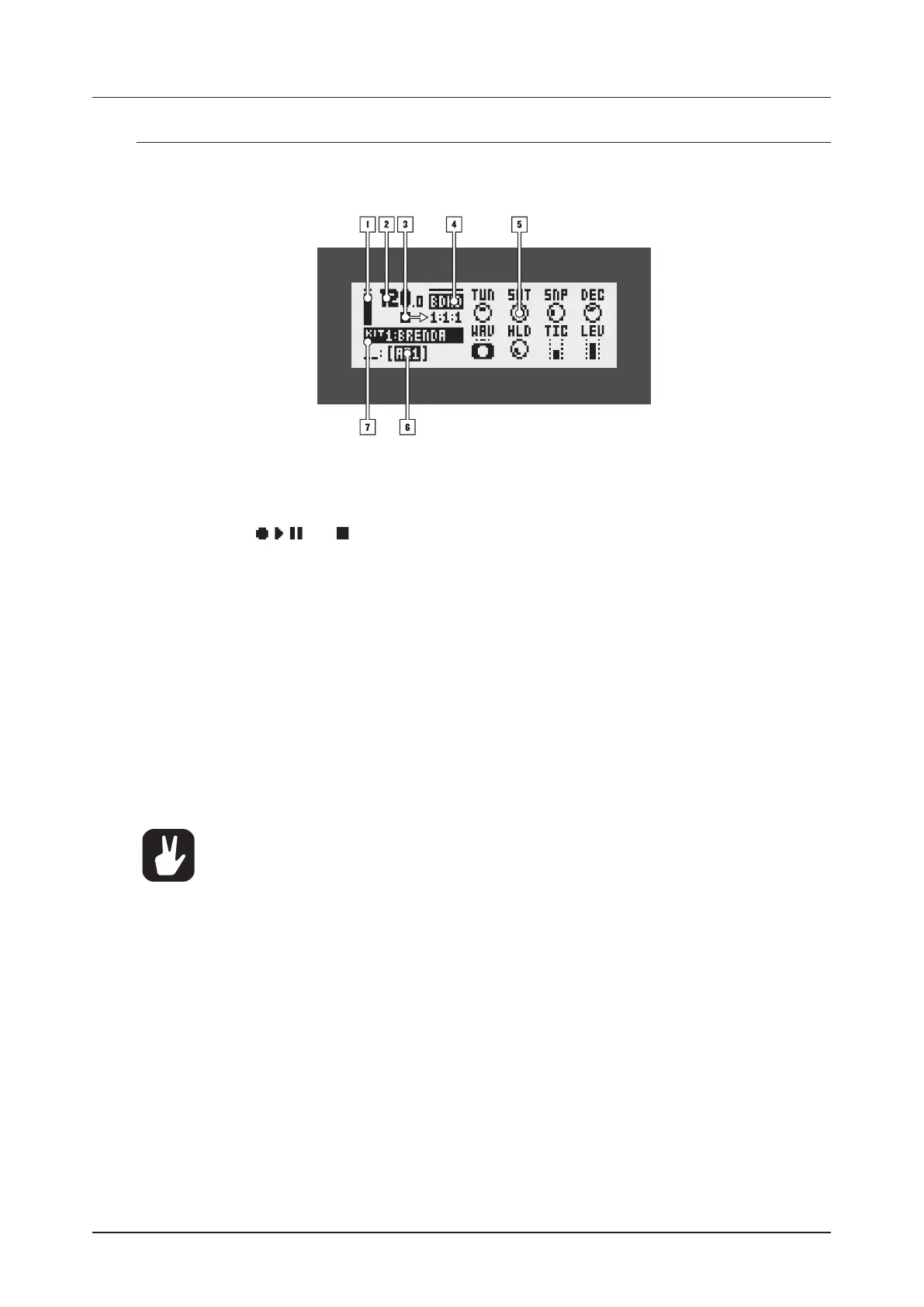 3. The playback/recording status of the sequencer shown with the standard “record”, “play”, “pause” and