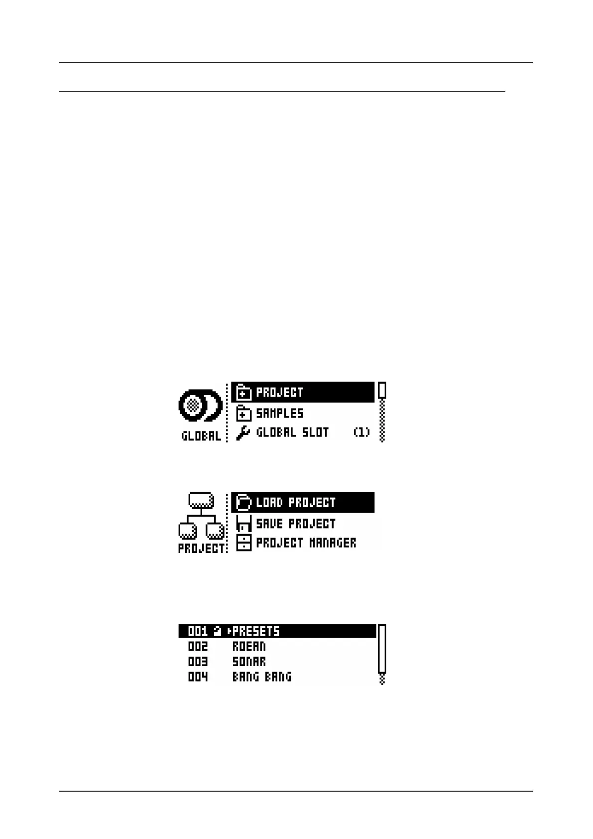 LOAD PROJECT opens a project selection screen where you choose a project to be loaded. Note that