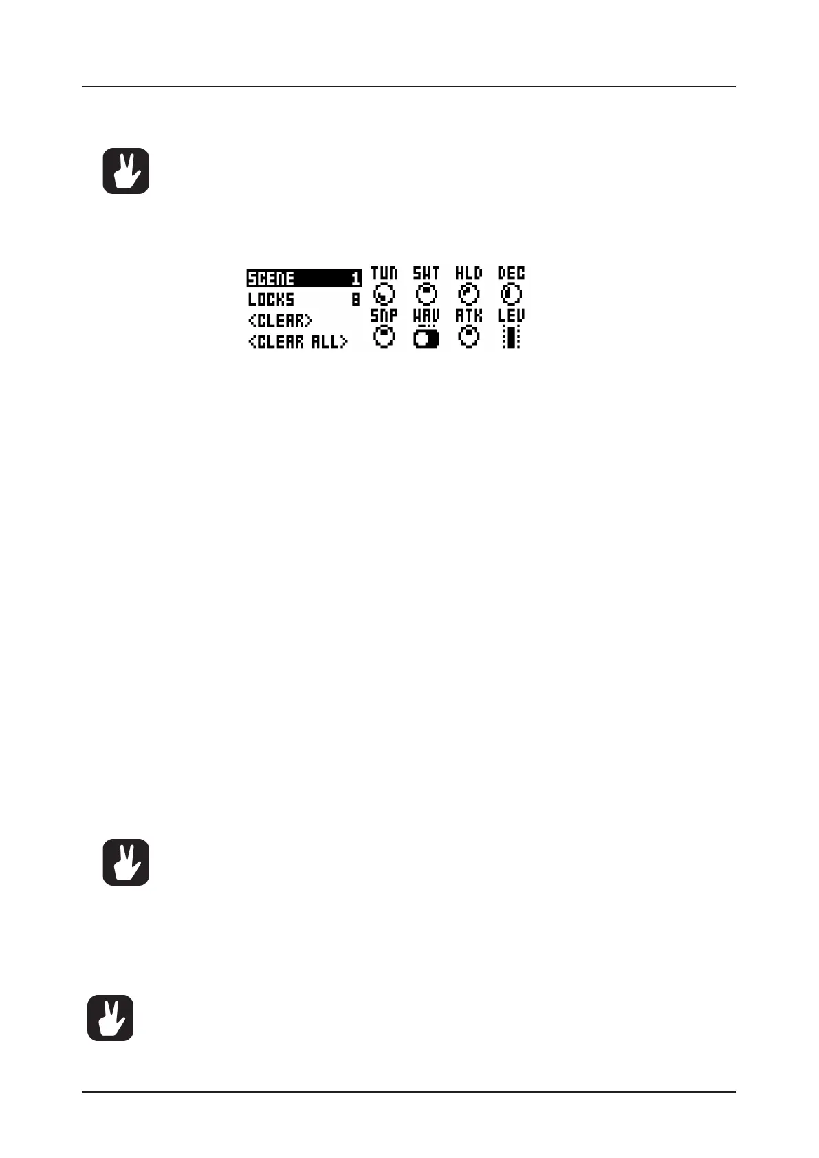 <CLEAR> clears all parameter locks assigned to the scene being edited. Press [YES/SAVE] when this