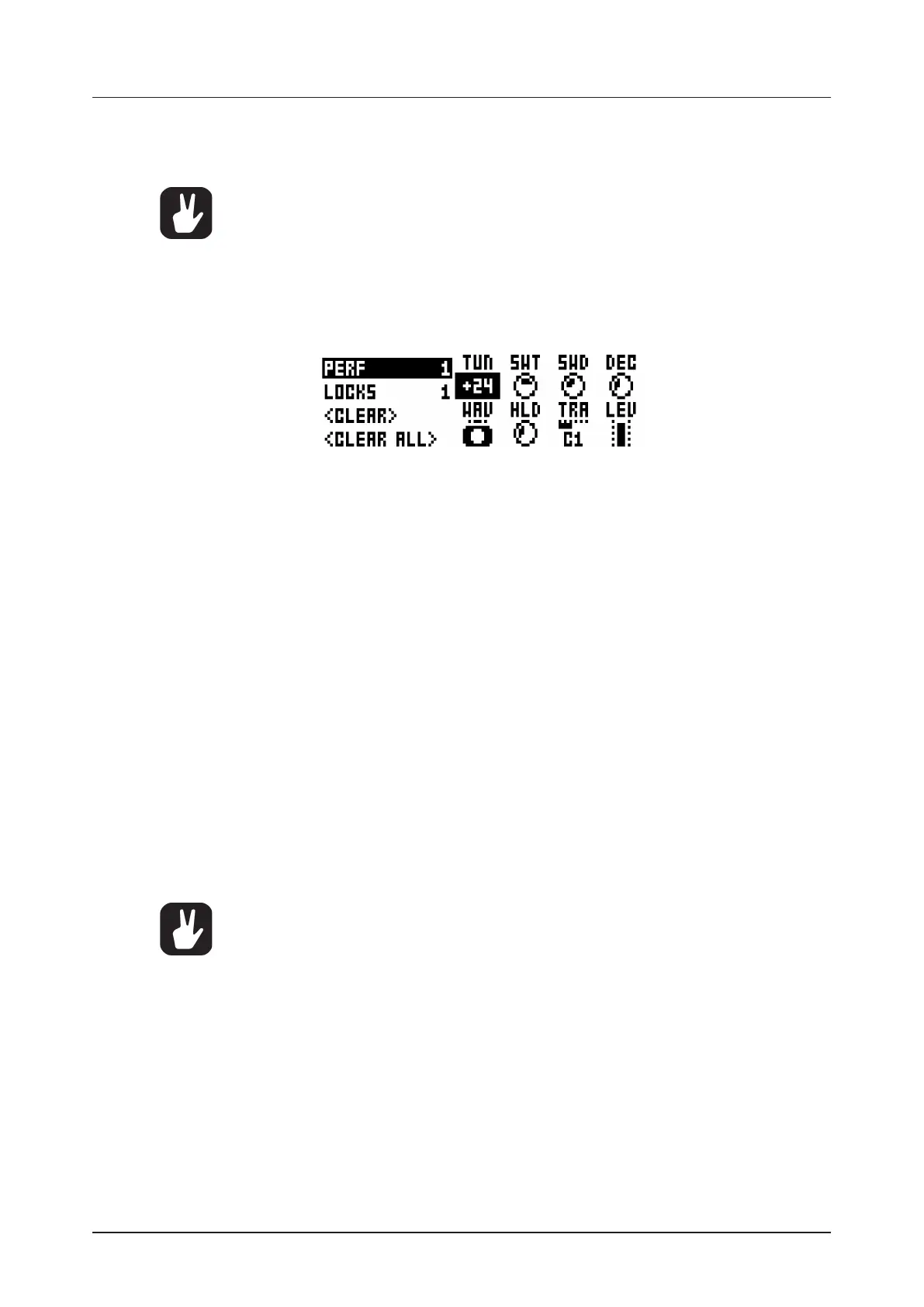 <CLEAR ALL> clears all parameter locks on all the 12 performance macros. Press [YES/SAVE] when