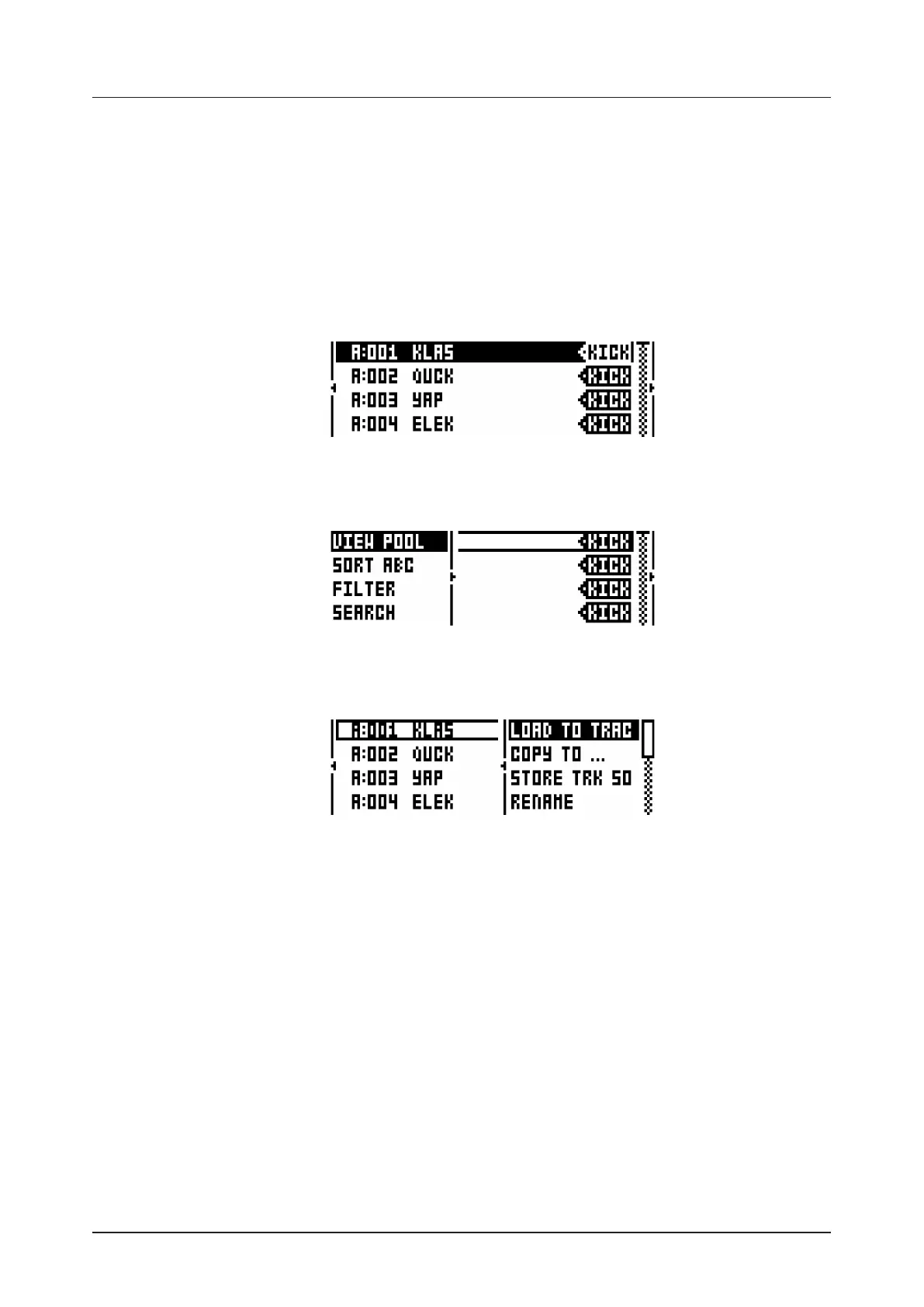 LOAD TO TRACK loads the selected Sound to the active track and makes it a part of the active kit.