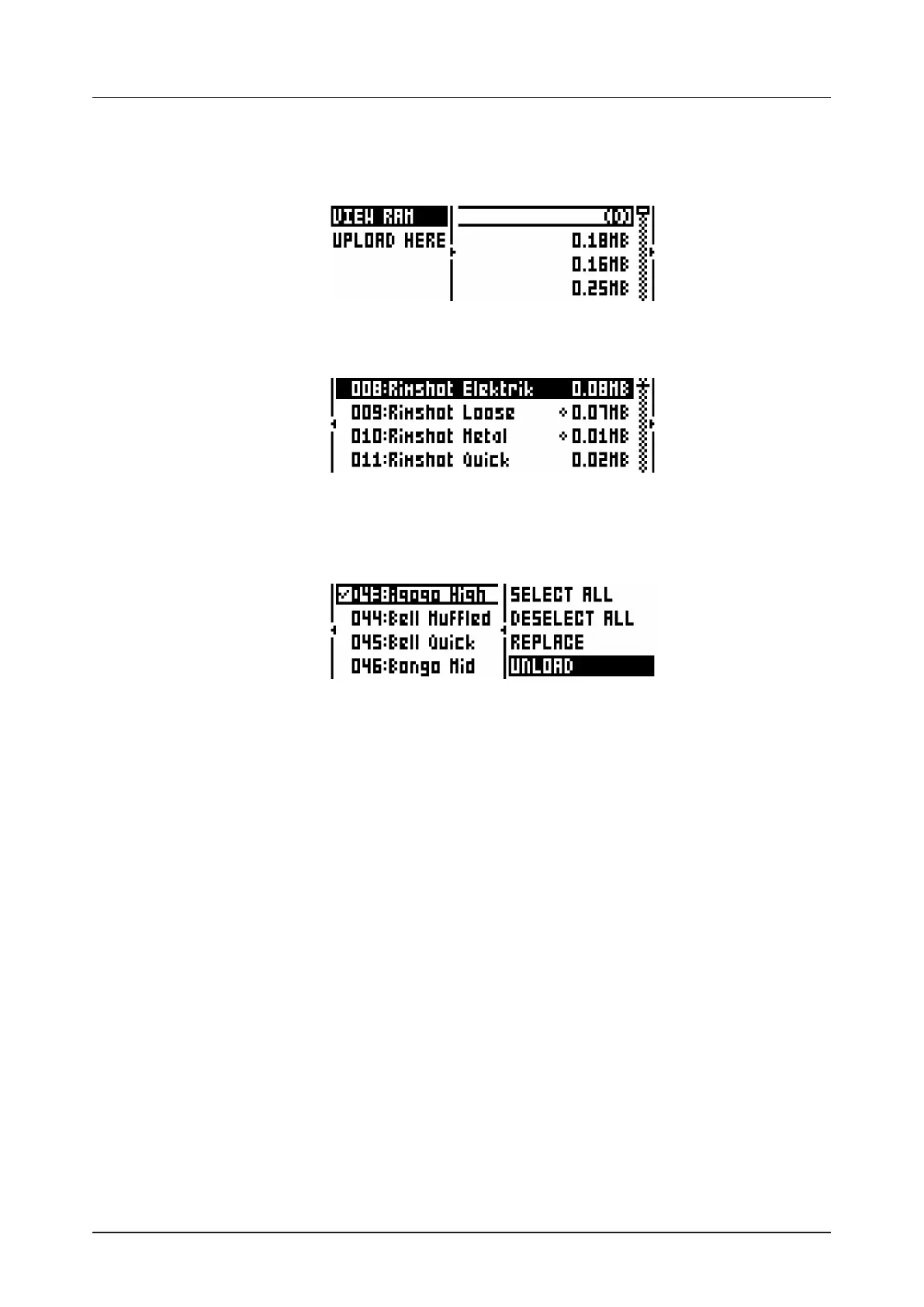 Select VIEW RAM and press [YES/SAVE]. A list will appear, showing all 127 user sample slots. A circle at
