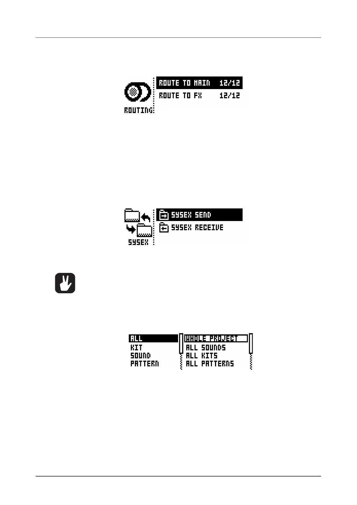 Here kits, Sounds, patterns, songs and global slots can be sent to an external device via the MIDI OUT