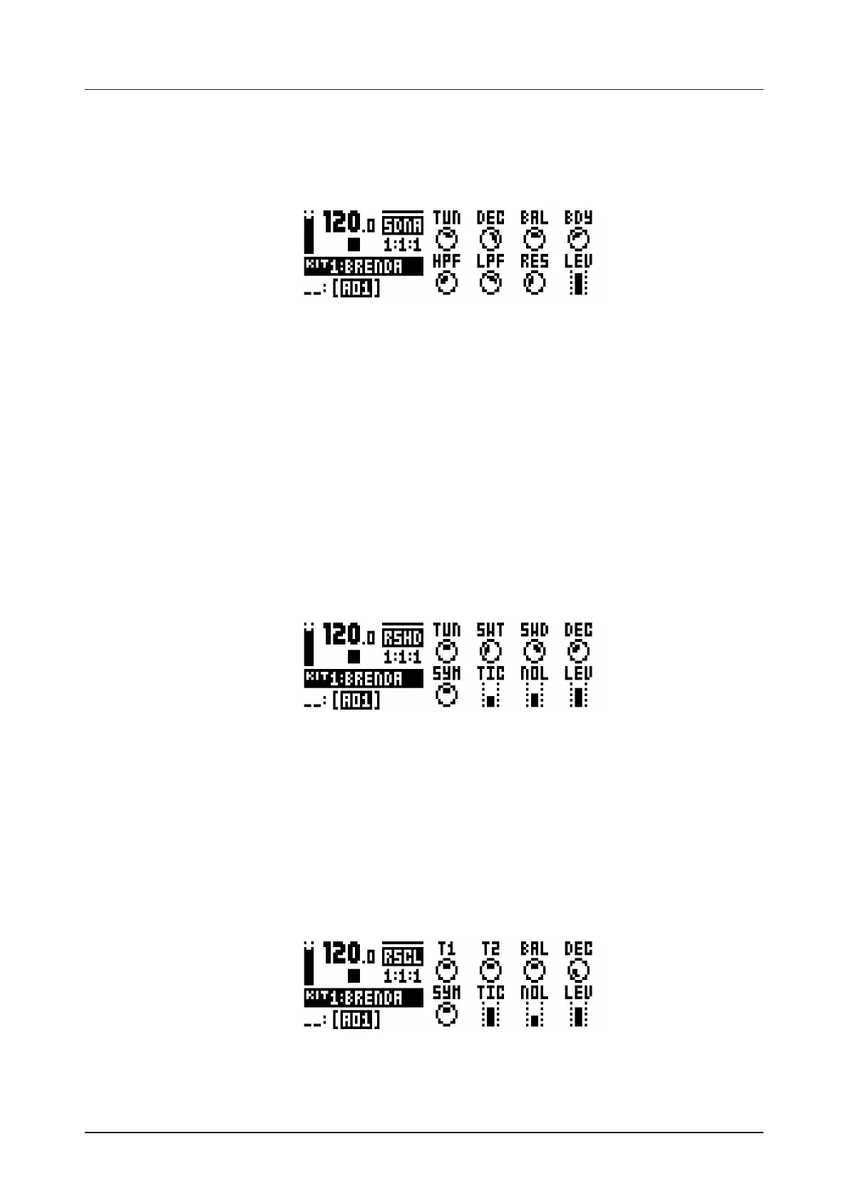 BDY (Decay Time) sets the length of the decay phase of the oscillator. (0–127)