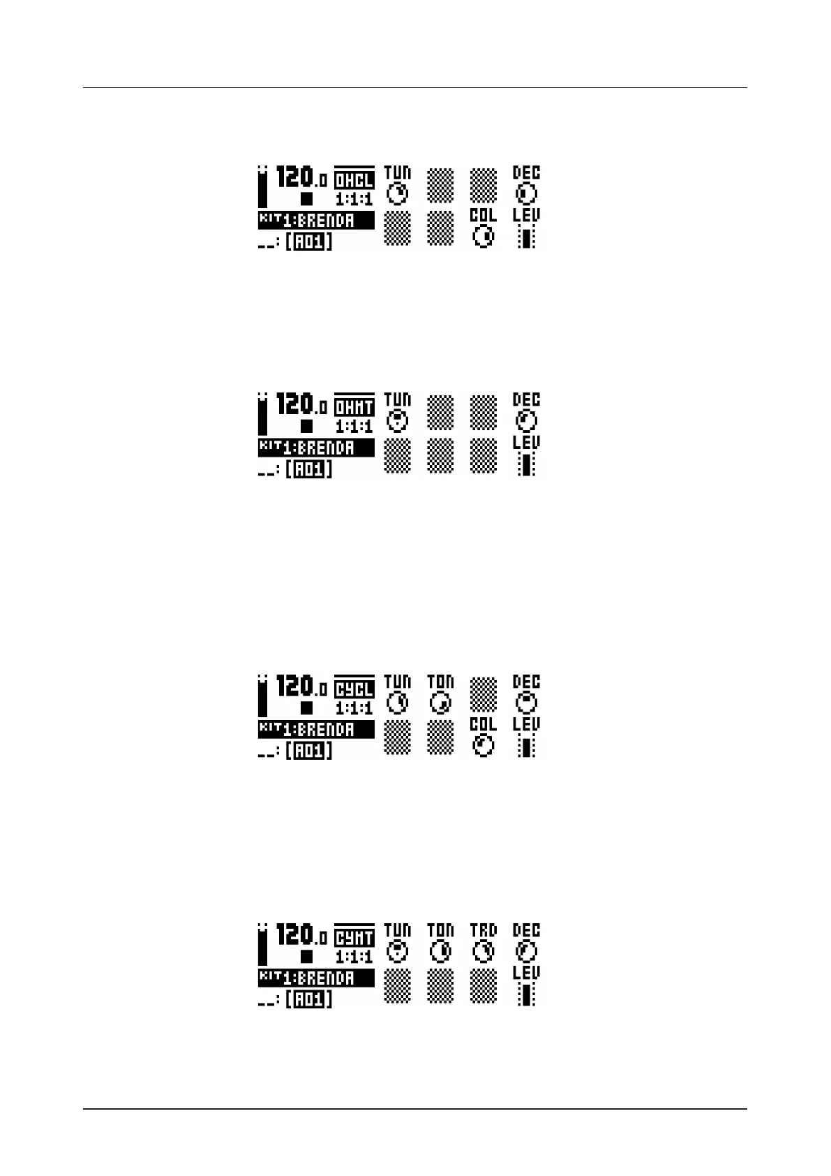 TUN (Tune) sets the pitch of the oscillators of the open hihat. (64–+63)