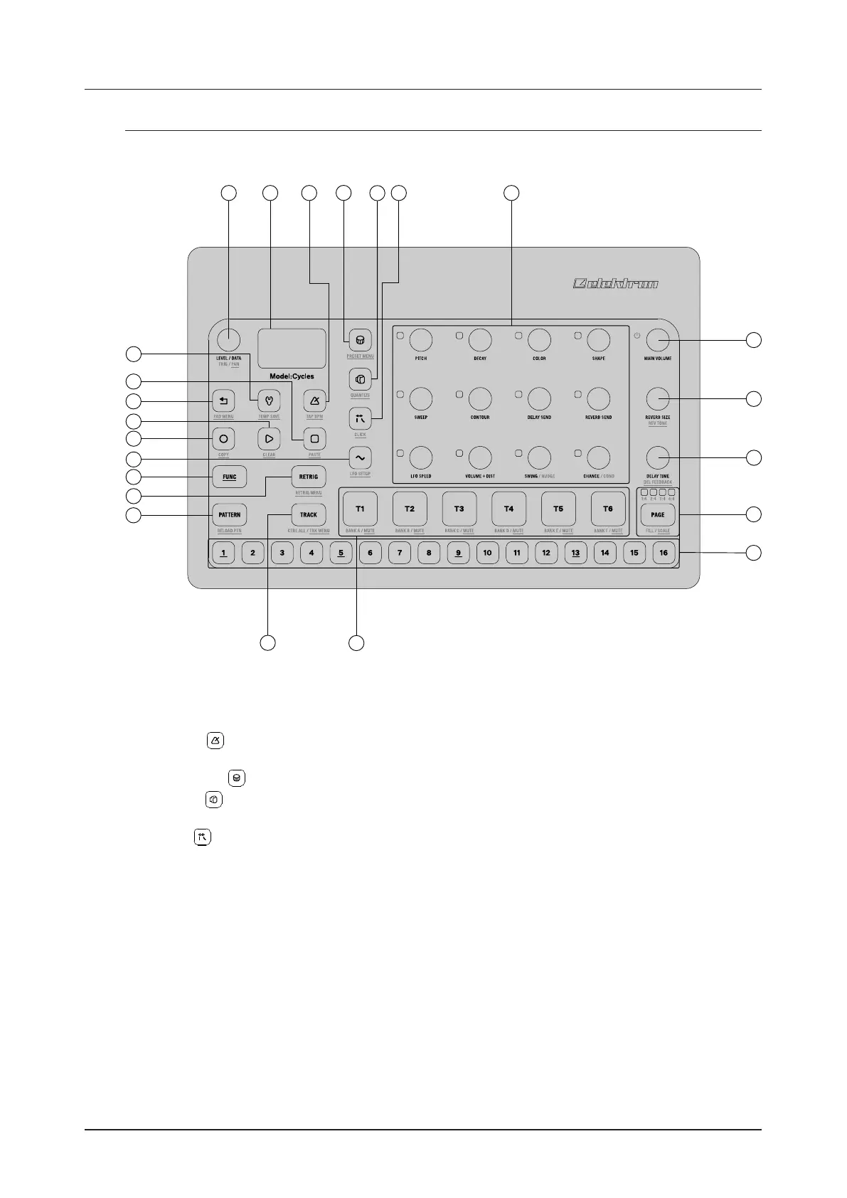 11. [PAGE] selects the active pattern page, if the pattern is made up of more than 16 steps. The <PATTERN