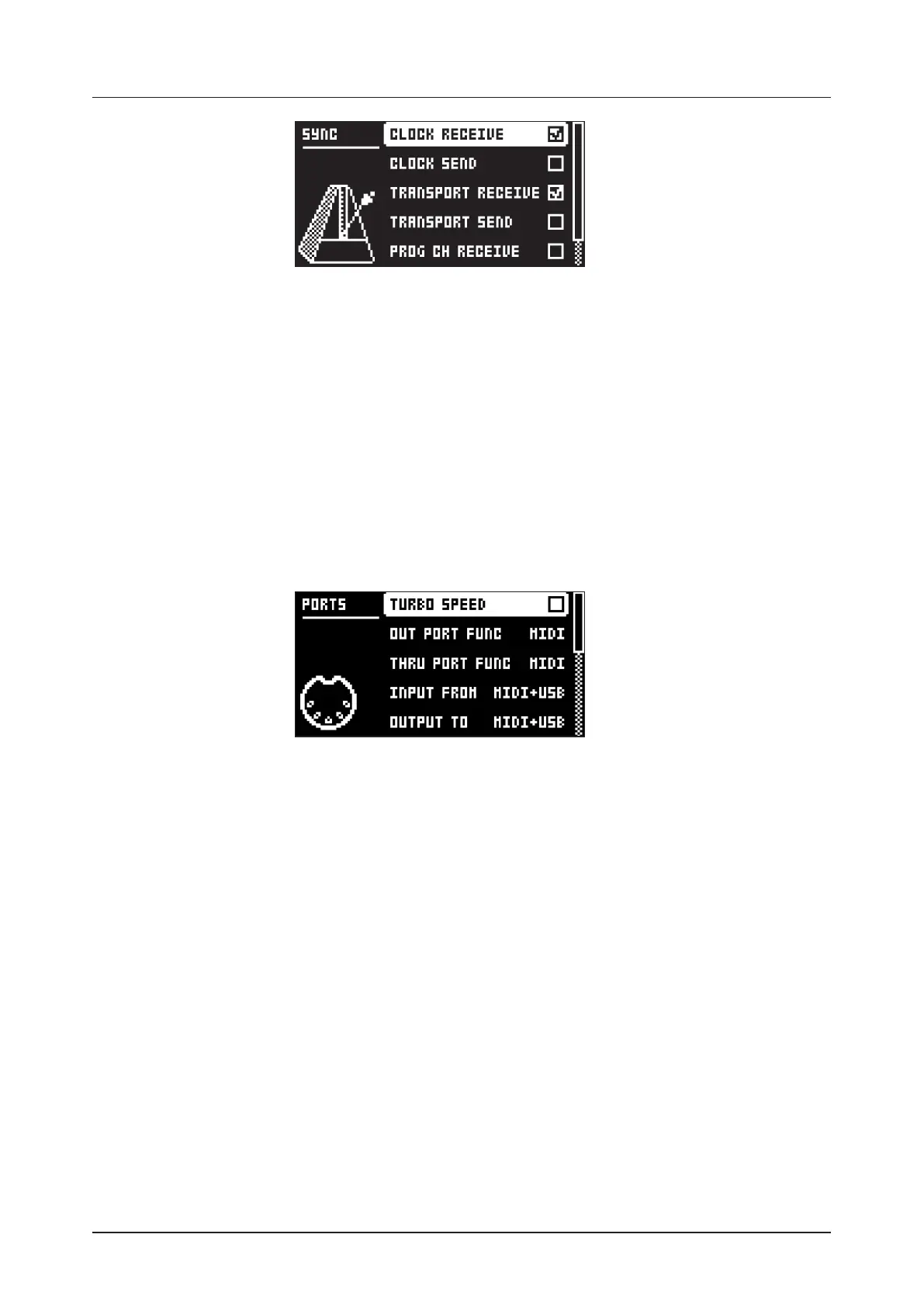 Here you find the MIDI port related settings. Change settings by using the [LEFT]/[RIGHT] arrow keys.