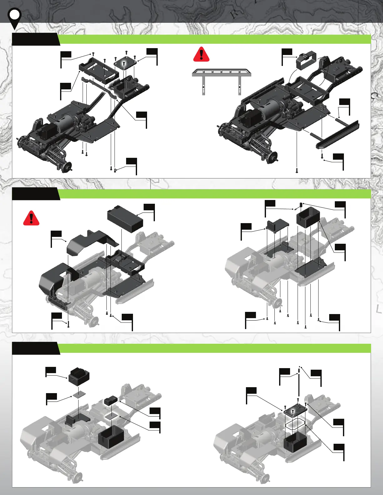 Element RC Utron SE - Chassis Electronics and Body Mounting; Gate 11: Battery Box and Sliders; Gate 12: Fenders, Receiver, and ESC; Gate 13: Servo, Receiver, and Antenna