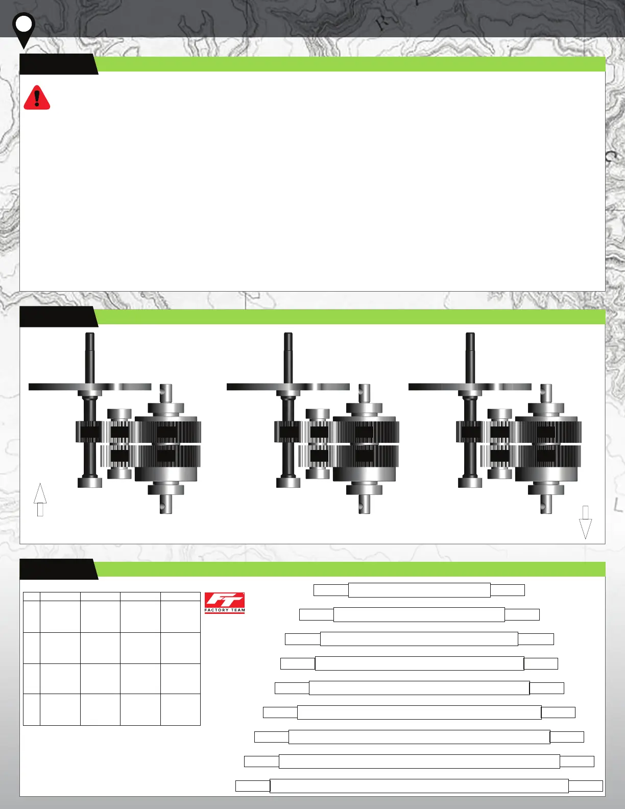 The 20T top shaft, 28T idler gear, and 52T drive gear will always be meshed together in all 3 gearbox confi gurations.