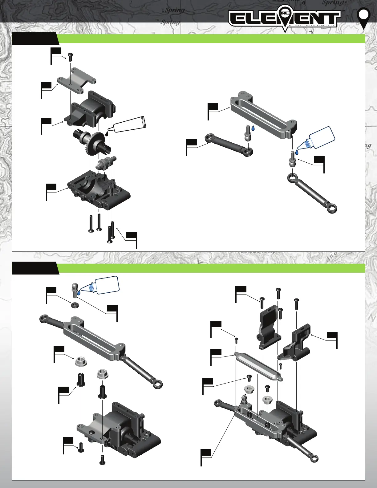 Element RC Utron SE - Chassis Steering and Differential Assembly; Gate 03: Steering Plate and Diff Cases; Gate 04: Steering Rack and Linkages