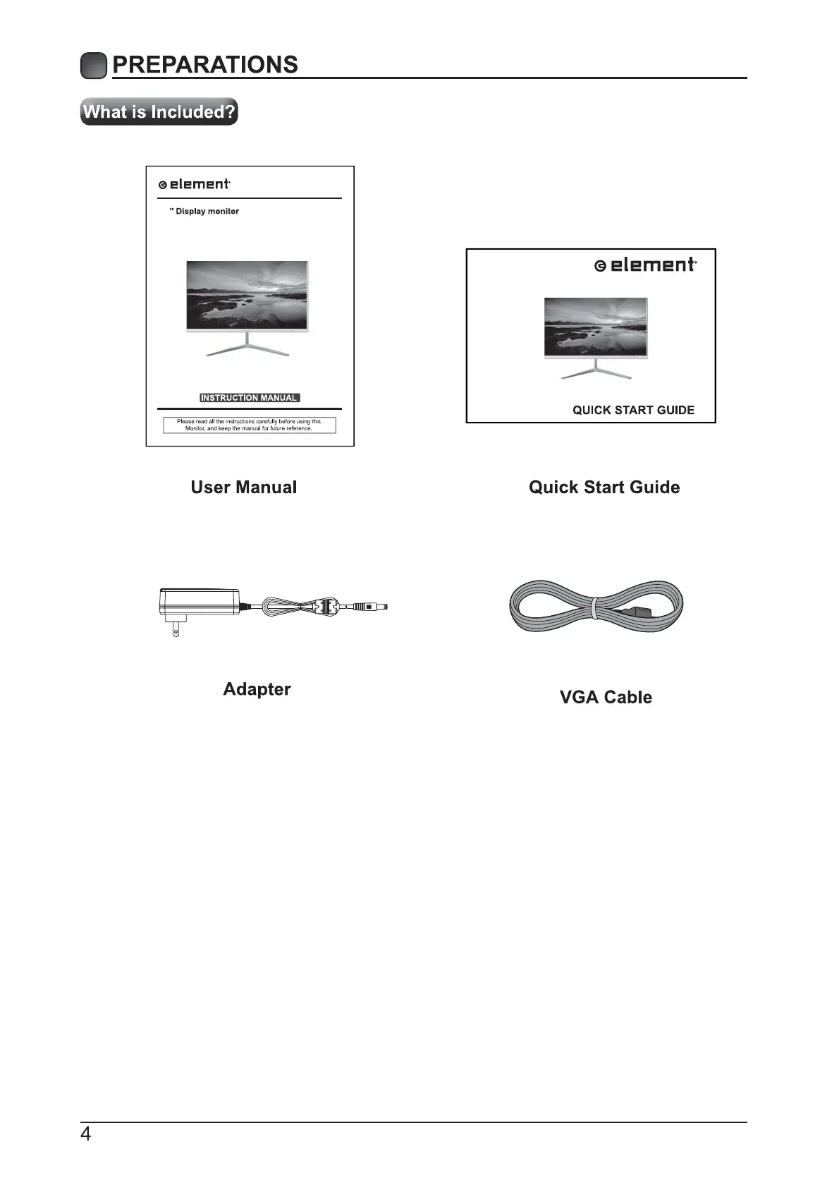 Element E1SW2418M - Preparations; What is Included; Power Indicator Light; Screen Image Setups