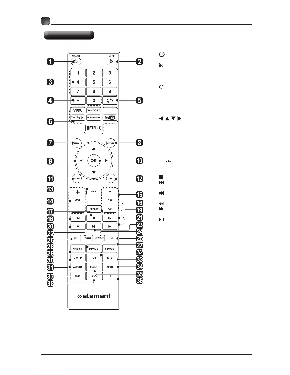 35. SLEEP:Set the TV sleep timer: OFF/5/10.../180