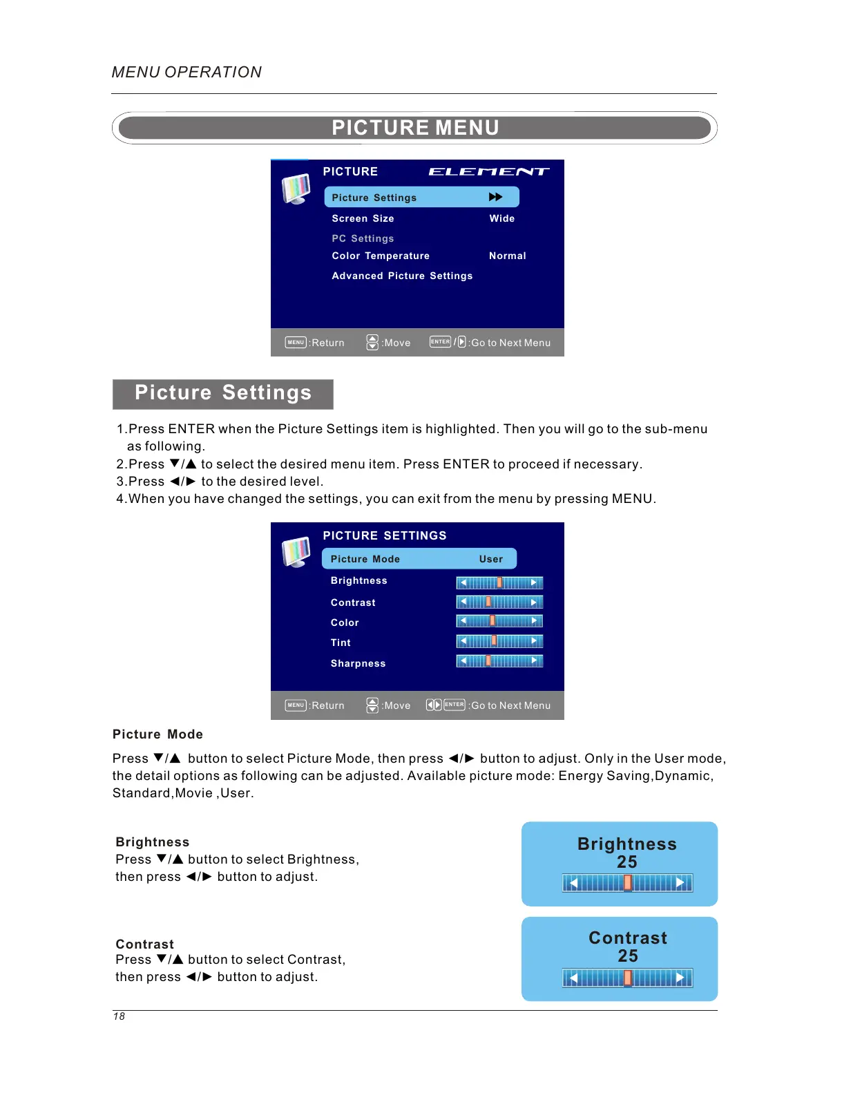 1.Press ENTER when the Picture Settings item is highlighted. Then you will go to the sub-menu