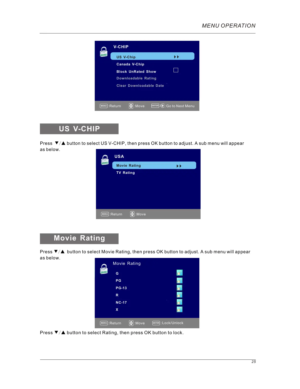 Press / button to select US V-CHIP, then press OK button to adjust. A sub menu will appear