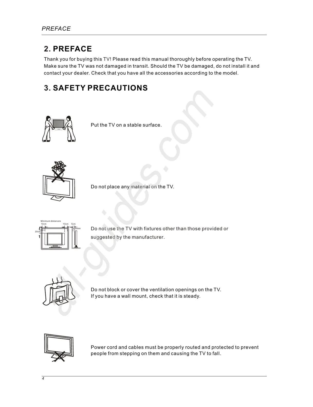 Do not block or cover the ventilation openings on the TV.