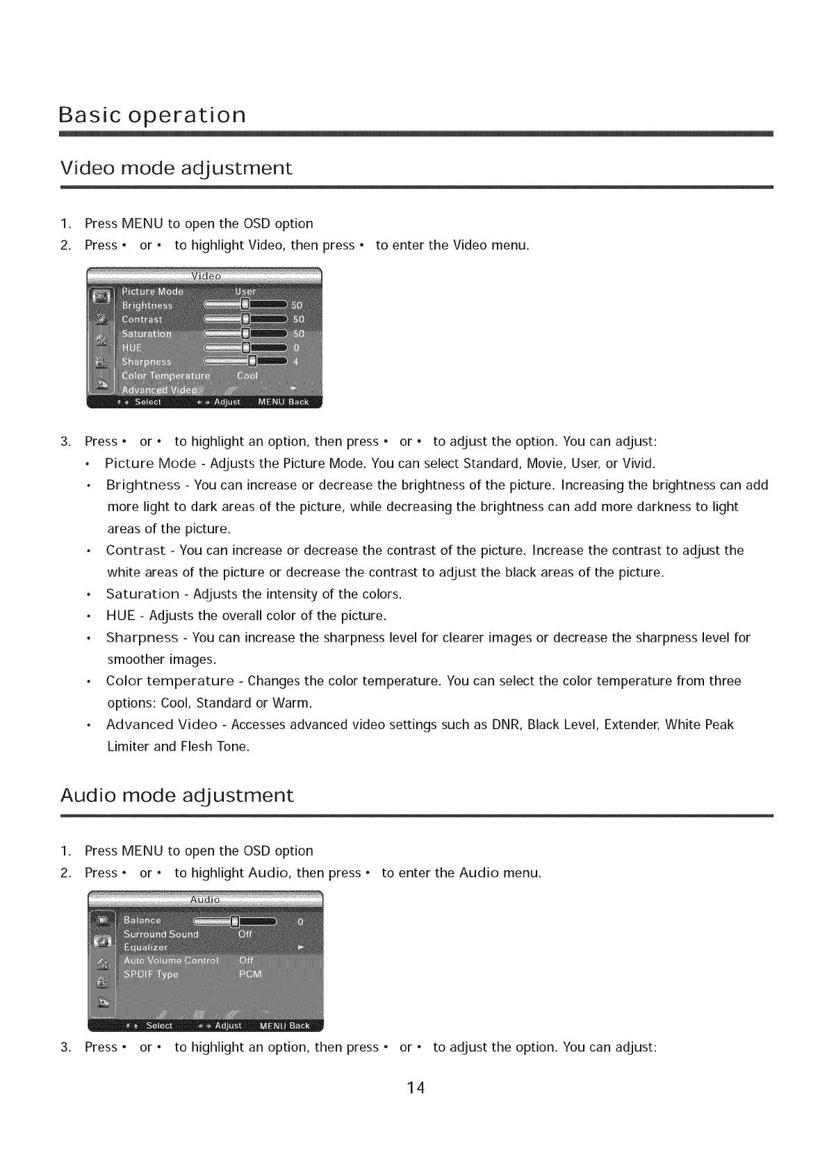 • Advanced Video - Accesses advanced video settings such as DNR, Black Level, Extender, White Peak
