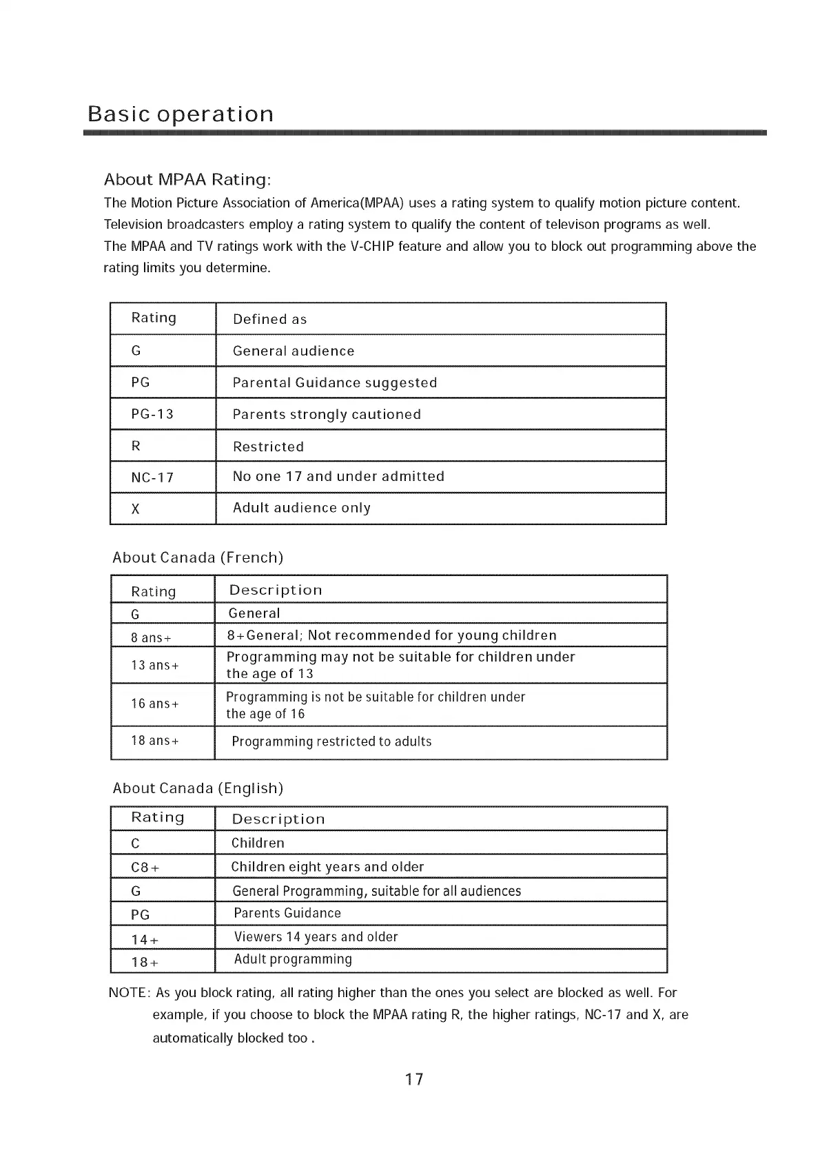 The MPAA and TV ratings work with the V-CHIP feature and allow you to block out programming above the