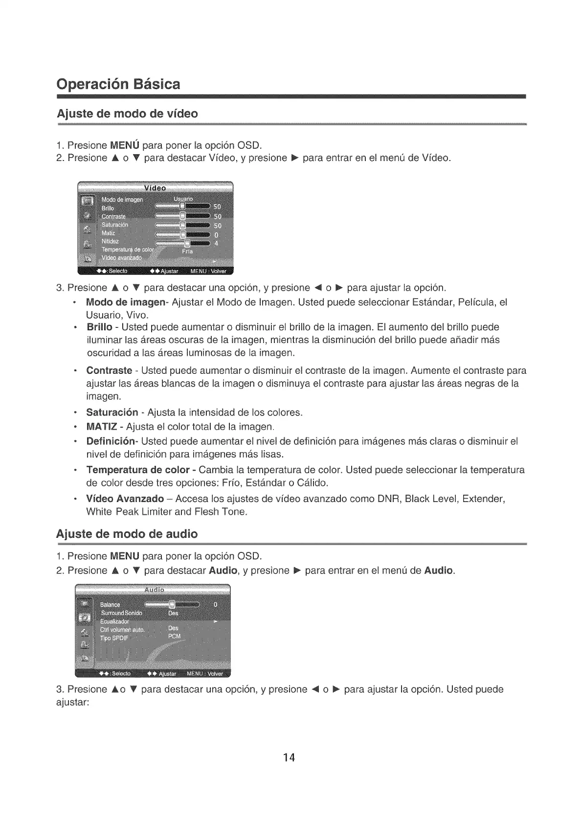 3. Presione A o V' para destacar una opcion, y presione 4 o _ para ajustar la opci6n.