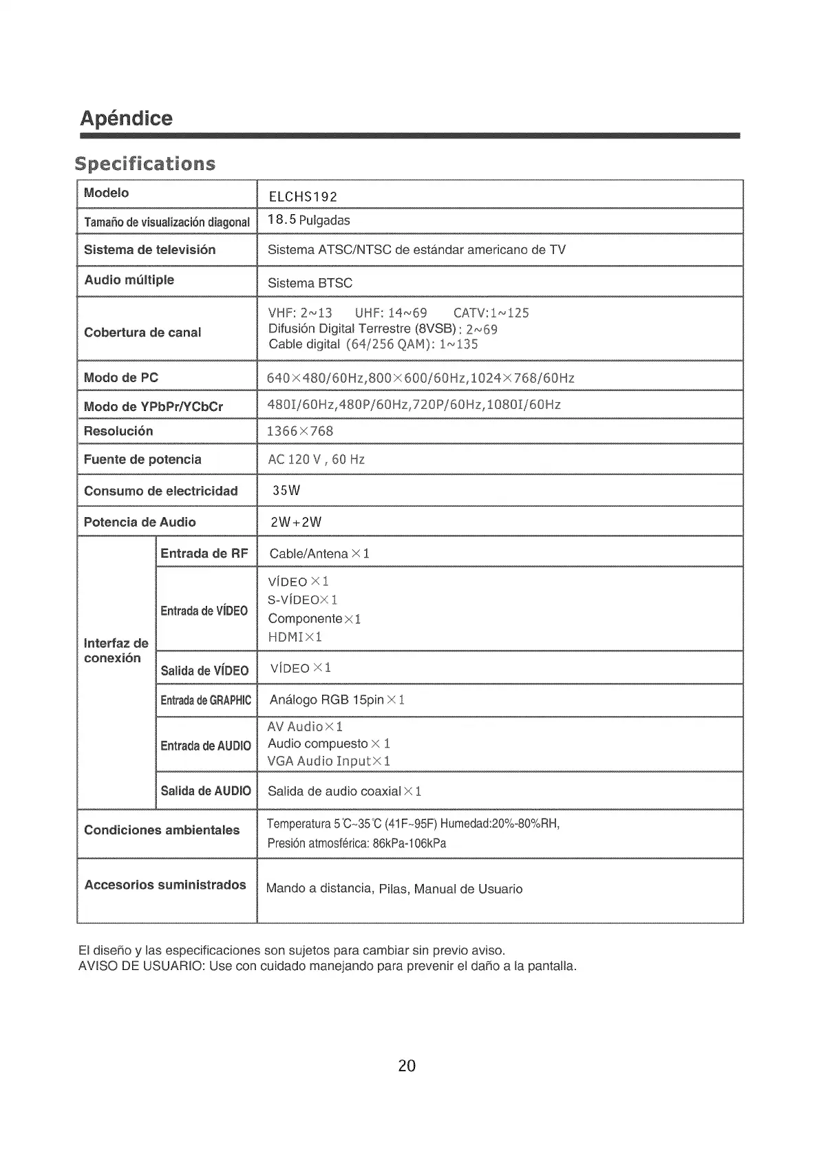 Condiciones ambientames Temperatura 5°C~35°C(41F~95F) Humedad:20%-80%RH,