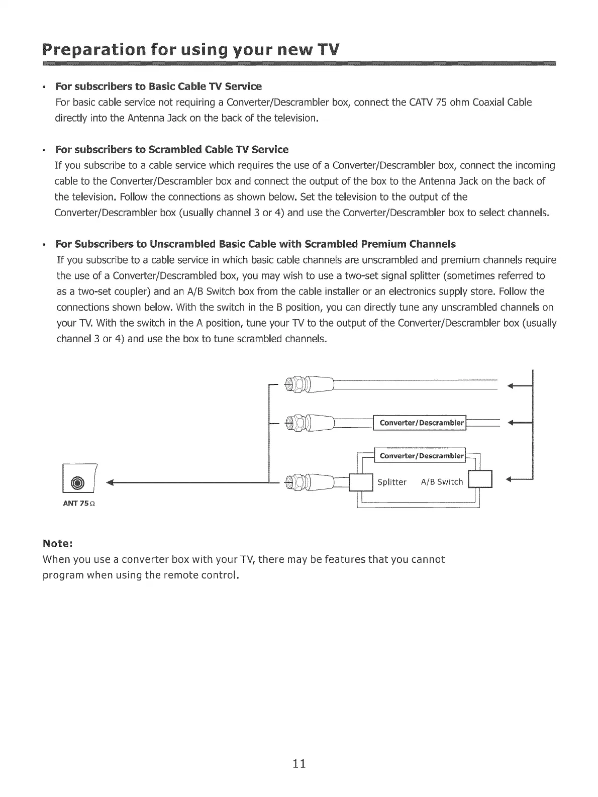 cable to the Converter/Descrambler box and connect the output of the box to the Antenna Jack on the back of