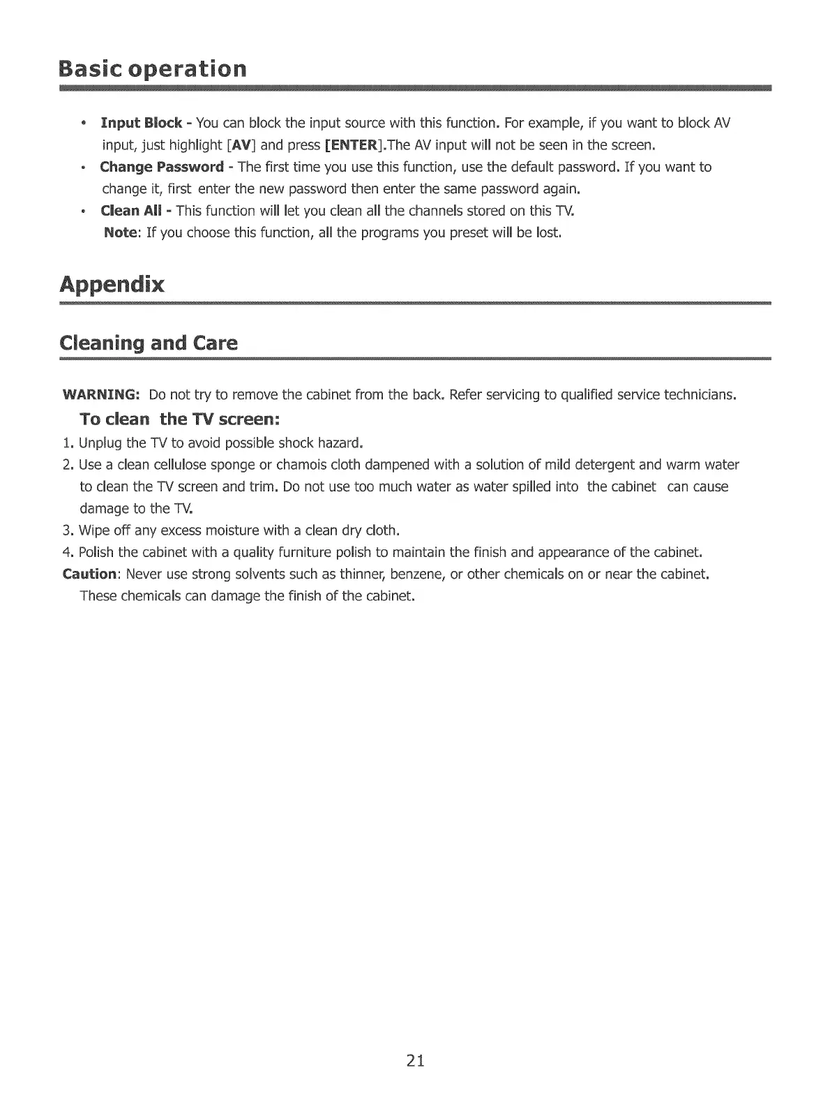 to clean the TV screen and trim. Do not use too much water as water spilled into the cabinet can cause