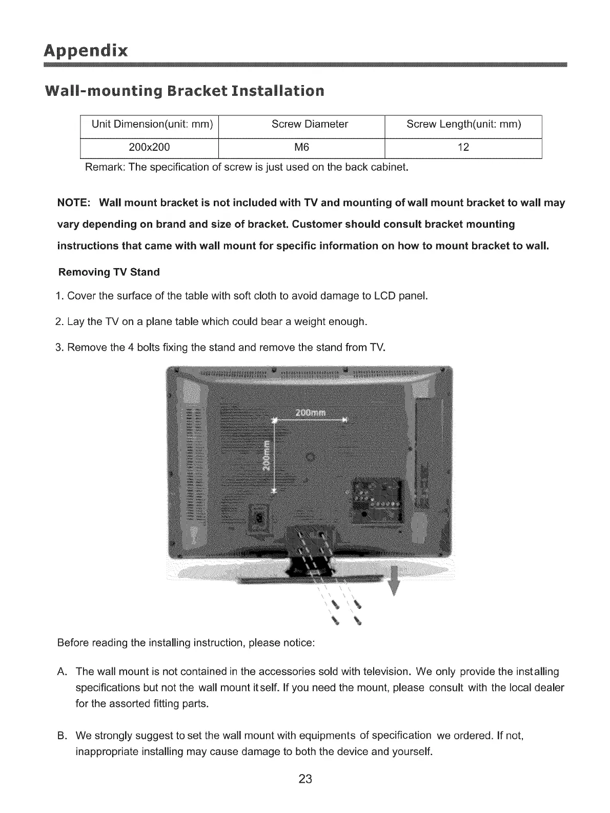 NOTE: Wall mount bracket is not included with TV and mounting of wall mount bracket to wall may