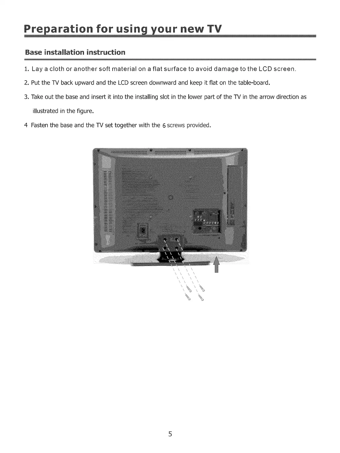 3. Take out the base and insert it into the installing slot in the lower part of the TV in the arrow direction as