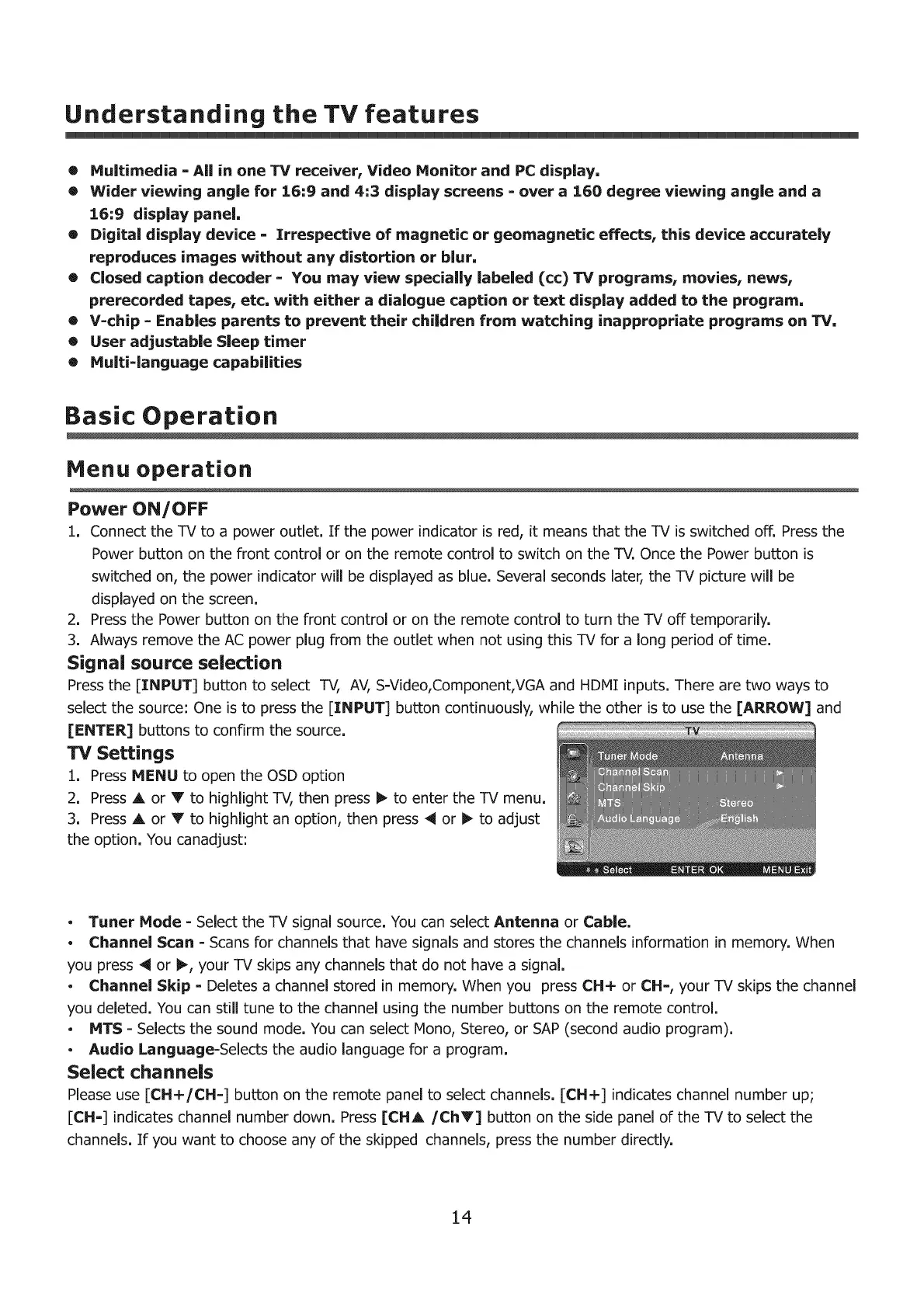 , Channel Skip = Deletes a channel stored in memory. When you press CH+ or CH=, your TV skips the channel