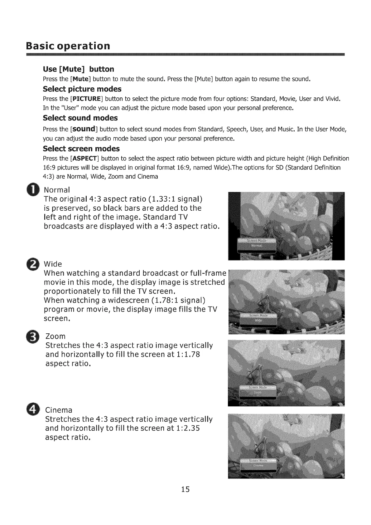 Pressthe [PICTURE] button to select the picture mode from four options: Standard, Movie, User and Vivid,