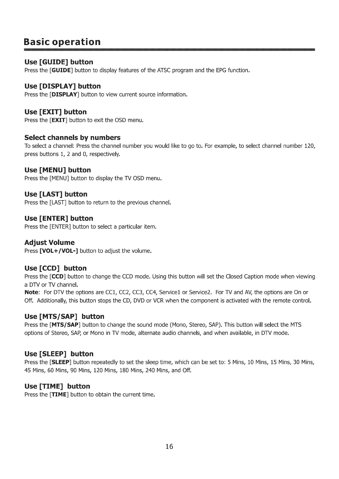 Press the [MTS/SAP] button to change the sound mode (Mono, Stereo, SAP). This button will select the MTS